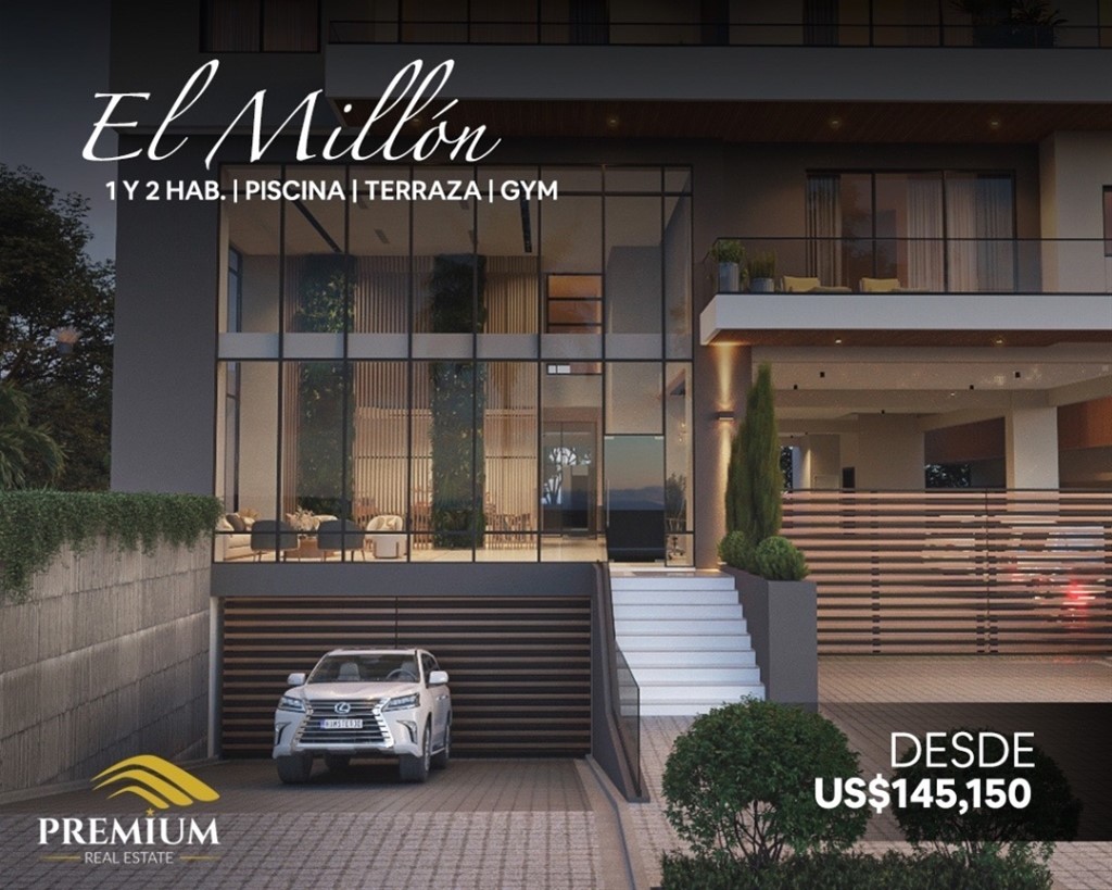 El Millón Reserva con: US$2,000 Desde US$145,150 Apartamentos de 1 y 2 habitaciones 1 y 2 Parqueos Desde 47 metros Amenidades del proyecto: 2 Ascensores 1 Ascensor de servicio Gas común Área social Planta eléctrica full Gimnasio equipado Lobby doble altura Cuarto de choferes Terminación en yeso Terminaciones: Pisos en porcelanato importado Cocinas modulares Techos con terminación en yeso Puertas de ingeniería enchapadas Pre-instalación aires acondicionados Entrega Diciembre 2027