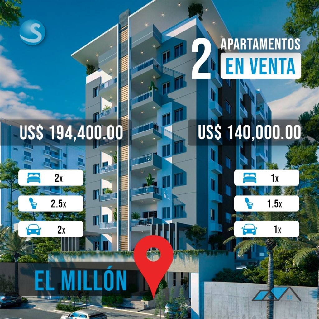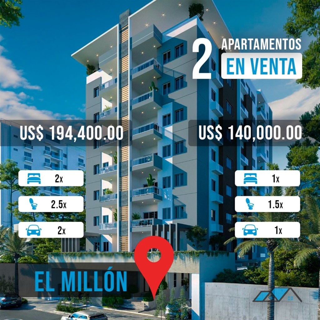 ¿Te imaginas vivir en el centro de la Ciudad, con increíbles vistas en un espacio acogedor? Si tú respuestas fue un sí, es tu gran oportunidad para adquirir un #Apartamento completamente NUEVO. ? Torre residencial ubicada en el Distrito Nacional, sector El Millón. ?? Una de las zonas más céntrica de la Ciudad. ?? Un Hogar perfecto para tu Familia. ?? ?? US$ 194,400.00 - 76.10 m² ?? 2x?? 2.5x?? 2x??? ?? US$ 140,000.00 - 49.20 m² ?? 1x?? 1.5x?? 1x??? ?? Planta Full. ?? Seguridad 24 horas. ?? GYM Equipado. ?? Walk-in Closet. ?? Lobby Amueblado. ?? Terraza. ?? Ascensor. ?? Punto de Carga de Vehículo Eléctrico. ¡Tu espacio ideal, al alcance de tu vida! ???????