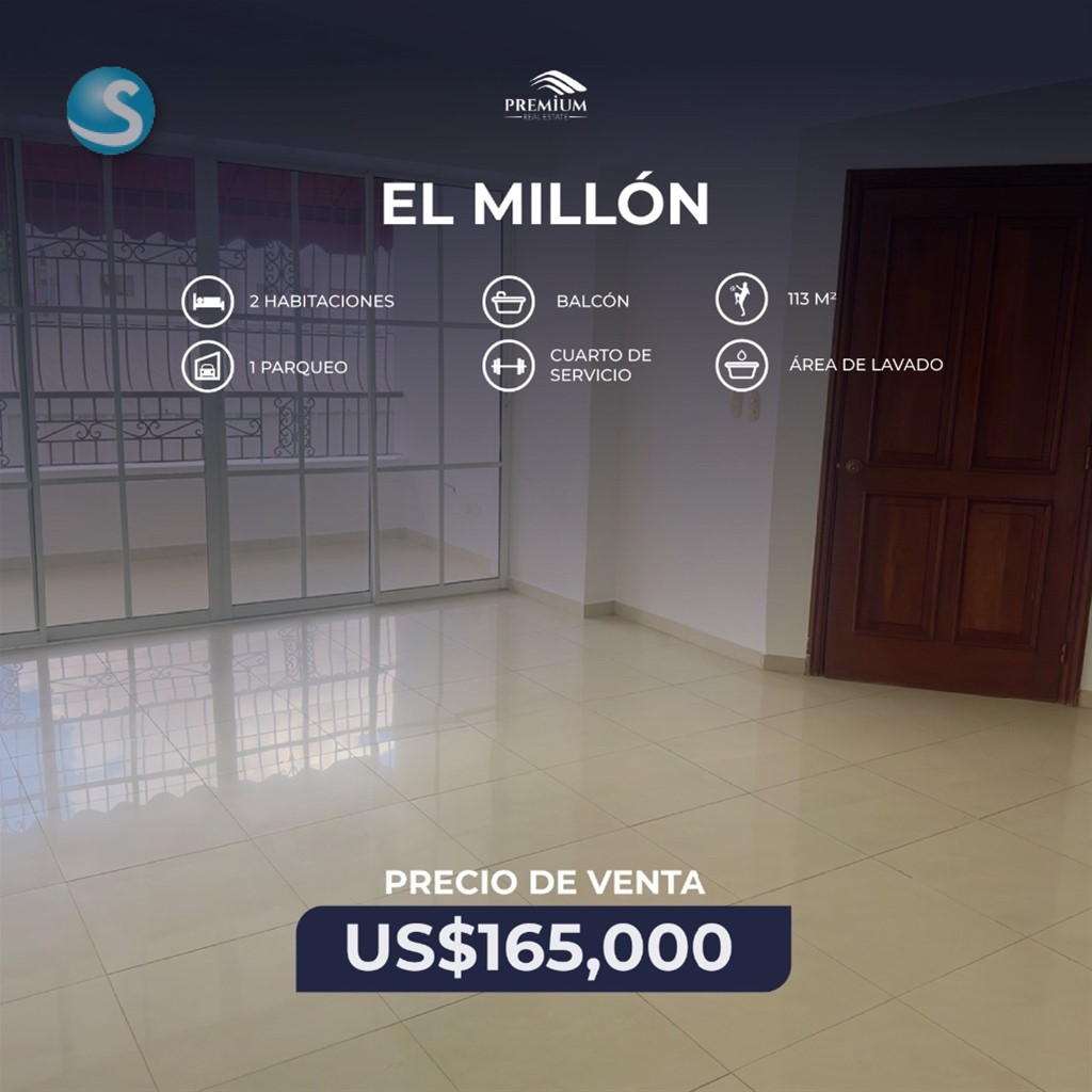El millón, DN.?? Excelente ubicación. 113 mts. 3er nivel 2 hab Hab. Principal con baño y walk-in ckoset. Cuarto de servicio con su baño. Sala/comedor. Balcón Área de lavado Ascensor 1 parqueo Locker Precio: 165,000 USD