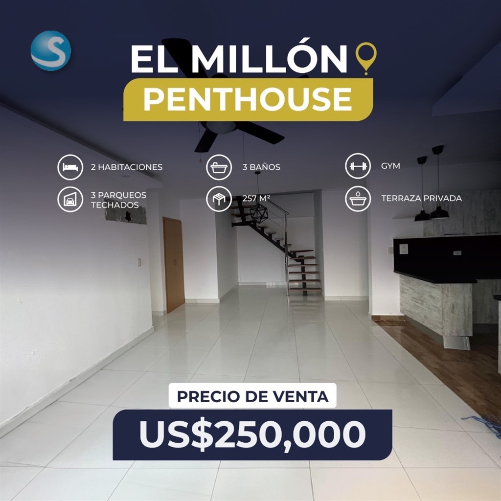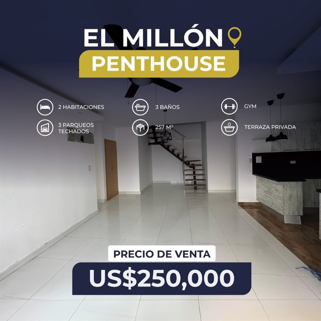 El millón-Penthouse 257mts 2 habitaciones 3 baños Balcón Sala Comedor Cocina Área de lavado Cuarto de servicio con baño 3 parqueos techados Terraza privada Ascensor Gas común Planta full Lobby Gimnasio Terraza techada y destechada Precio de venta: US$250,000