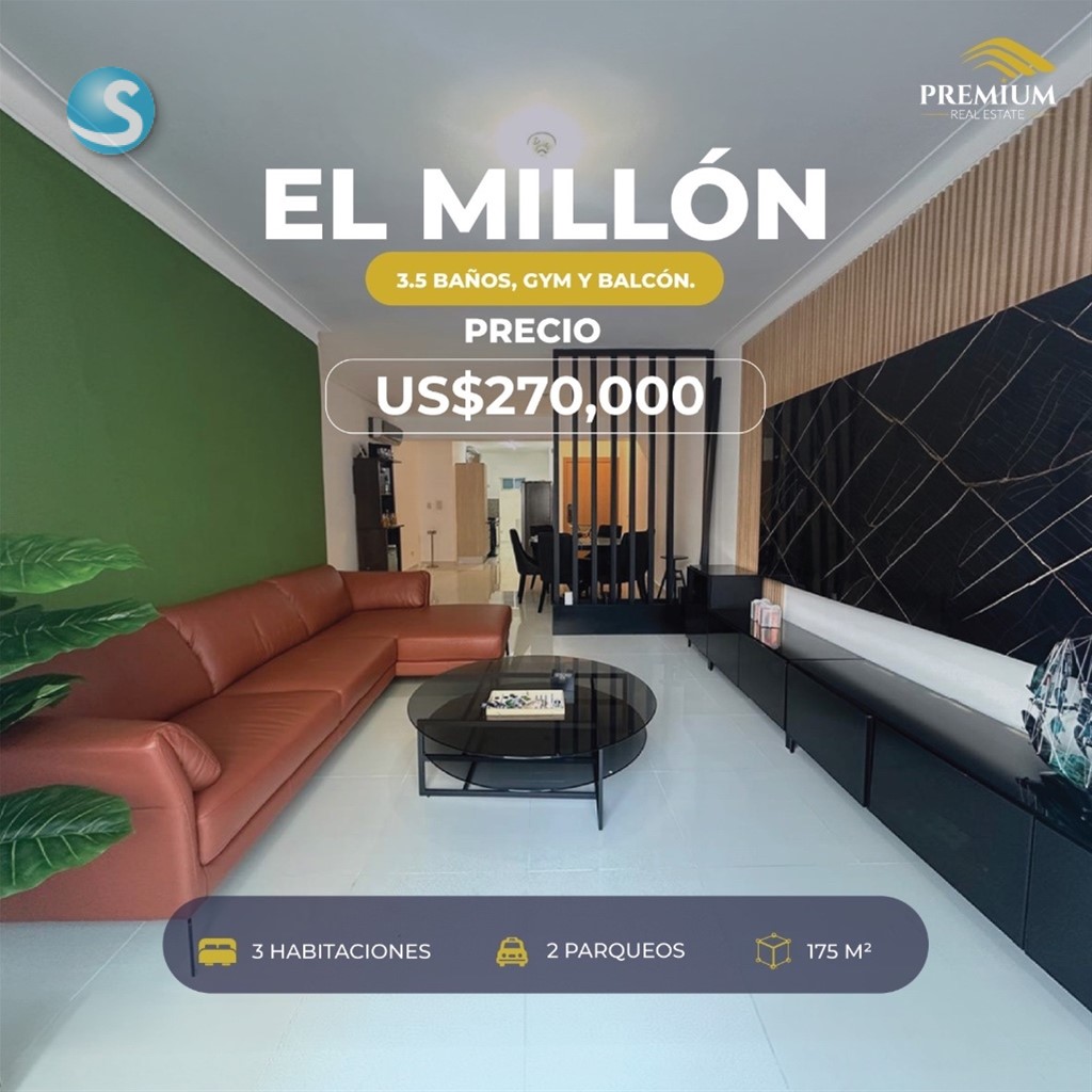 Millon 175mts Nivel 4 3 Habitaciones 3.5 Baños Sala Comedor Cocina Balcón Área de lavado Cuarto de servicio con baño 2 Parqueos Techados Paralelos Shutter 4 aires acondicionados incluidos Gym Terraza común Ascensor Lobby Portón eléctrico Planta full Gas común Precio US$270,000