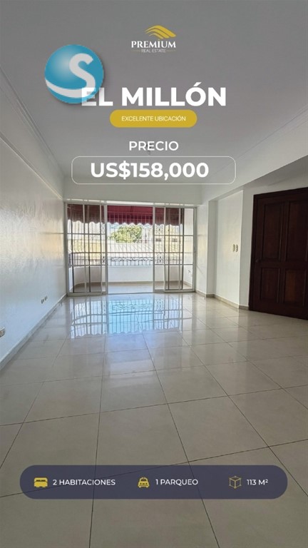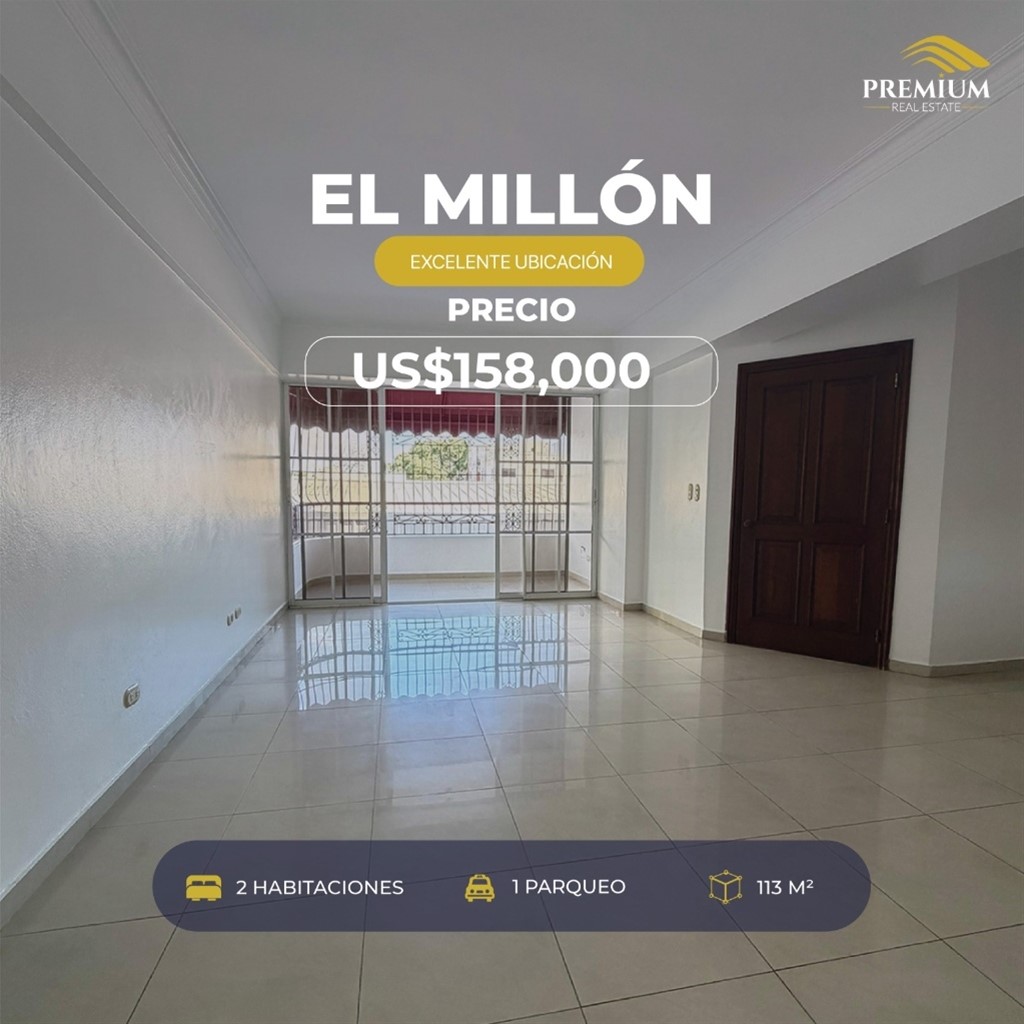 El millón, DN.?? Excelente Ubicación! 113 mts. Más 12 mts de parqueo. 3er nivel 2 hab Hab. Principal con baño y walk-in ckoset. Balcón Sala/comedor Área de lavado Cuarto de servicio con su baño Ascensor Gas Común Planta Eléctrica áreas comunes Intercom Seguridad 24/7 1 Parqueo Mantenimiento RD$5,500 Precio Rebajado: USD$158,000