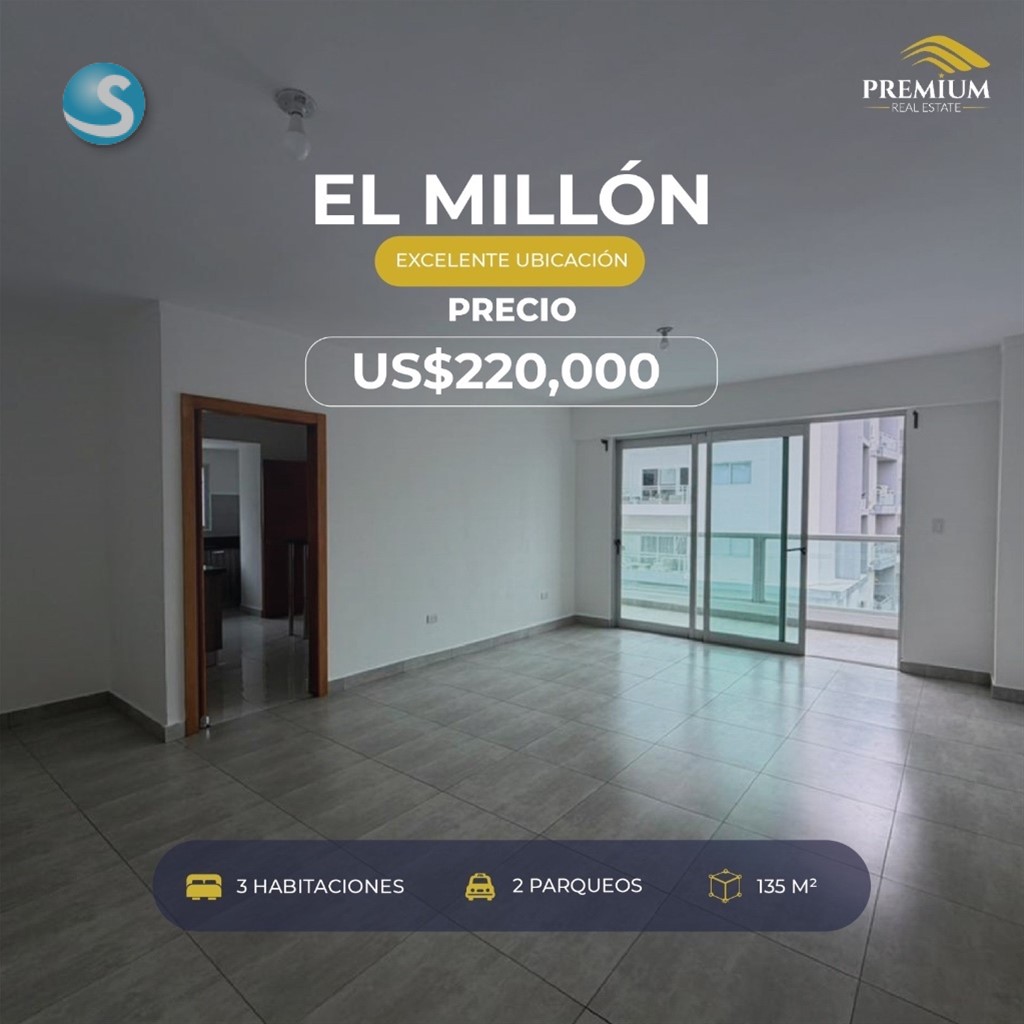 **el apartamento ideal para tu familia en el millón** disfruta de amplitud, comodidad y una excelente ubicación en este hermoso apartamento ubicado en un 4to piso: **135 m² bien distribuidos** • 3 habitaciones • 2.5 baños • balcón • sala | comedor | estar familiar • cocina • área de lavado con baño **2 parqueos paralelos** **amenidades del residencial:** • ascensor • planta eléctrica full • lobby elegante • terraza común • gimnasio **precio de venta:** us$220,000 **mantenimiento:** rd$10,000 un espacio perfecto para vivir cómodo, seguro y en una de las zonas más demandadas de la ciudad.