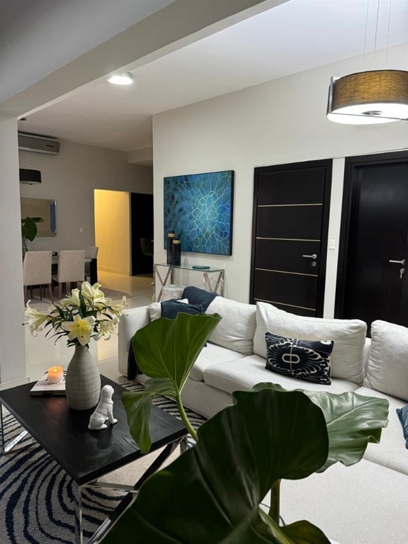 Rento apartamento completamente amueblado en la mejor zona de Naco. ¡Excelente ubicación! Cerca de la Gustavo Mejía Ricart, Tiradentes, a pasos de restaurantes, bares, bancos, centros comerciales, cines, clínicas, supermercados etc. 149 mts2 netos de construcción 2 habitaciones cada una con su baño y w/c. 2.5 baños Sala con aire acondicionado Comedor con aire acondicionado Cocina con estufa, extractor, nevera Área de servicio y de lavado con torre de lavadora y secadora Terraza privada con jacuzzi y BBQ Hierros de seguridad El edificio tiene: Lobby climatizado con servicio de conserjería Piscina con área de gazebo Gimnasio Salón para eventos sociales Plantas electicas 2 Elevadores Ducto de basura Portón eléctrico Intercom Gas común Estacionamiento lineal para 2 vehículos US. 1,900.00 incluye mantenimiento