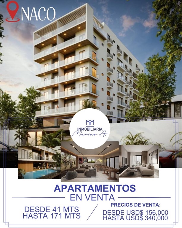 Hermosos Apartamentos en Torre Nueva y Moderna. En el Corazón de la ciudad de Santo Domingo, Naco??. Desde 41 mts² Hasta 171mts² * Excelente Ubicación * ?Majestuoso Lobby * ?Sala * ?Comedor * ?Cocina * ?Balcón * ?Área de Lavado * ??Habitaciones con su baño. * ?Principal con Walking Clóset * ?Baño de visitas * ?Ascensores * ?Parqueos * ?Area Social * ?Gym * ?Piscina Precios de Venta: Desde USD$156,000 Hasta USD$340,000 Invierte y Disfruta de la comodidad de tener tu propio hogar.?? Entrega Septiembre 2026. Más información 809-903-8000 Inmobiliaria Marino A.