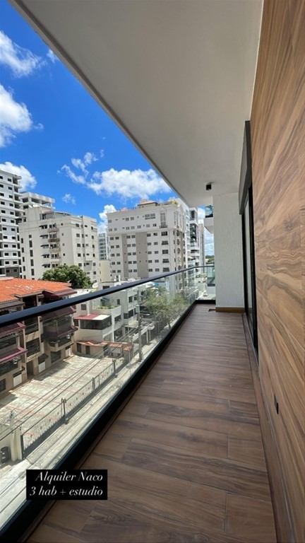 Alquilo lujoso Apartamento con Linea Blanca de 3 Habitaciones mas Estudio en Naco con Hermoso Lobby amueblado y área social. Características: Sala Balcón Estudio Cocina Comedor Desayunador 1/2 Baño de visita 3 Habitaciones cada una con su Baño principal con walk in closet Cuarto de Servio con su baño 2 Parqueos paralelos Área de lavado Amenidades: Lobby amueblado y climatizado Terraza techada y destechada Área de juego para niños Salón de actividades Seguridad 24 horas 2 Ascensores Gimnasio Picuzzi BBQ PAA-012-07-25
