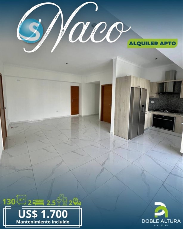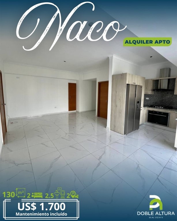 Alquiler apartamento en Naco – US$1,700 mensuales (mantenimiento incluido) ?? Piso alto en torre de lujo en el corazón de Naco, 130 m², cerca de supermercados, restaurantes y todo lo que necesitas. Características del apartamento: • 2 habitaciones, cada una con su baño, walk-in clóset y aire acondicionado • Amplia sala • Cocina amueblada con línea blanca • Área de lavado • Habitación de servicio con su baño • ½ baño de visita • 2 parqueos paralelos • Ascensor • Planta full Amenidades del edificio: • Piscina • Gimnasio equipado • Terraza • Área de BBQ • Área infantil • salón de eventos • Sport Bar • Seguridad 24/7 • Lobby Elegante