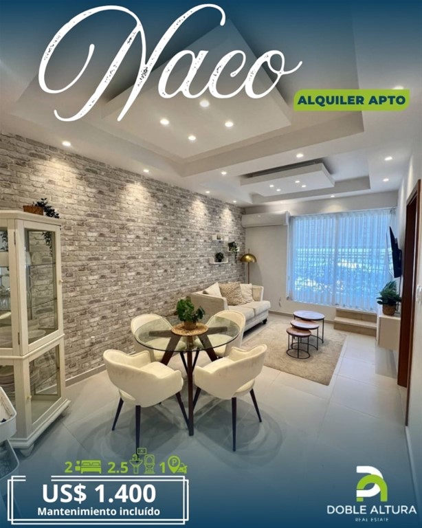 Apartamento amueblado en Torre de lujo en el corazón de Naco – Precio US$1,400 con mantenimiento incluido Vive con comodidad y estilo en una de las zonas más exclusivas de la ciudad, rodeado de supermercados, restaurantes y todo lo que necesitas a tu alcance. Distribución: *76 metros cuadrados • Sala amplia y luminosa • Balcón acogedor • Cocina equipada con línea blanca • Medio baño de visita • 2 habitaciones, cada una con su baño • 1 parqueo techado Amenidades de la torre: • Piscina • Terraza • Área de BBQ • Gimnasio • Área Infantil • Salon de eventos • Lobby elegante • Ascensor • Planta full • Seguridad 24/7 • Internet incluido • Locker