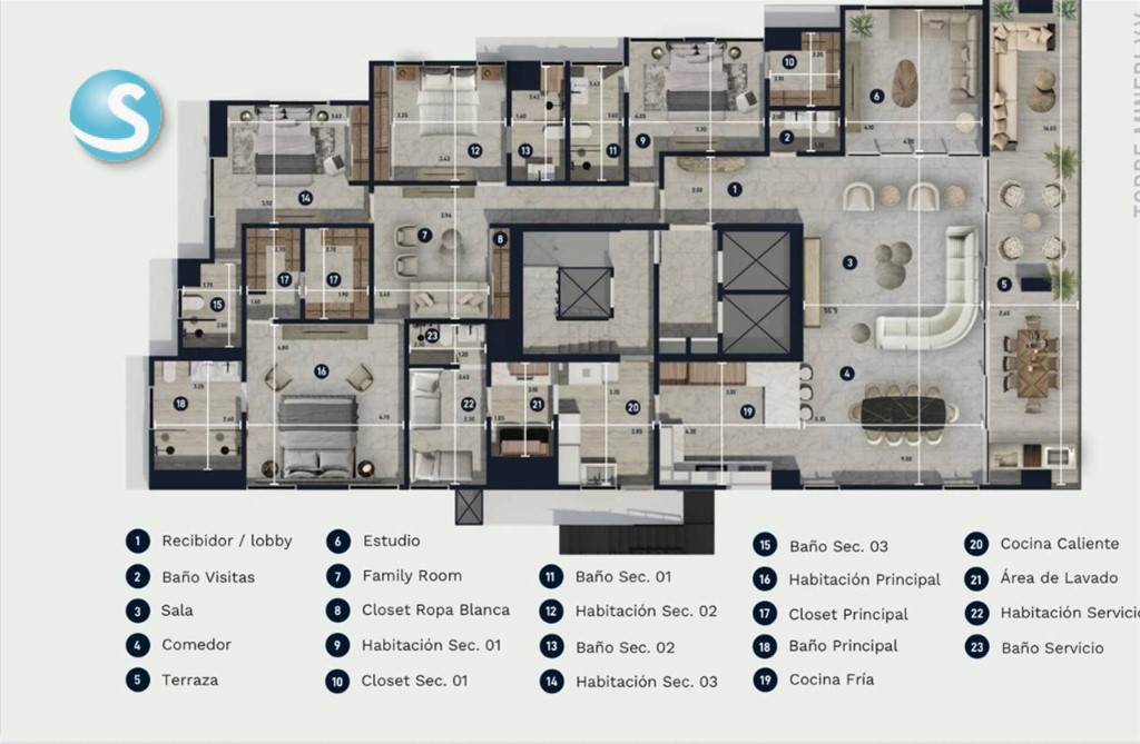 Confort y Lujo encontraras en este proyecto de un apartamento por piso donde busca llevar confort a sus futuros inquilinos. Cuenta con amplios espacios que generan una sensación de apertura y ligereza. Concebidos bajo una distribución sectorizada que permite un uso estratégico de todas las zonas de la unidad habitacional. Separando las áreas sociales, de servicio y las privadas, logramos difuminar sus fronteras según las transitamos, pero sin que pierdan su carácter espacial único. Amplias ventanas hábilmente localizadas en el perímetro de la unidad permiten dotar de cuantiosa luz y ventilación, potenciando las cualidades de frescura, claridad y vida de cada apartamento. En conjunto con una altura de entrepiso ideal generan sentimientos serenidad que solo pueden existir al lograr el balance perfecto entre espacialidad, buen diseño y buen gusto. #2599