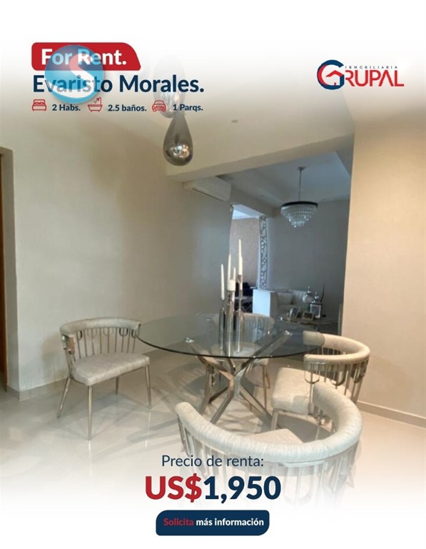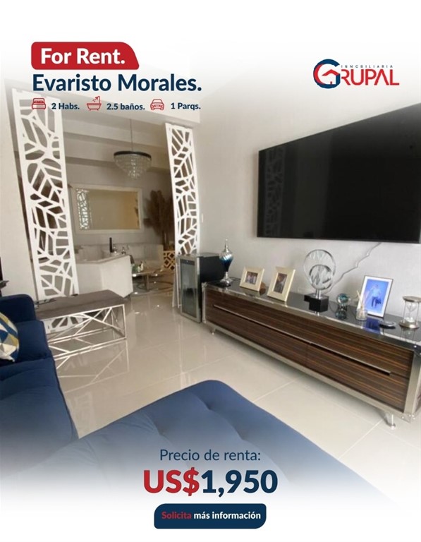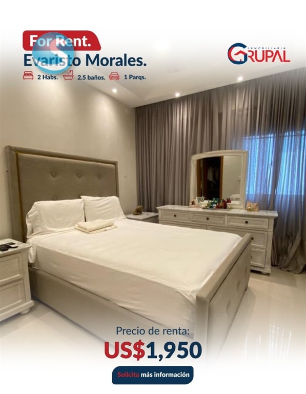 Alquiler en exclusiva torre ubicada en Evaristo Morales. 2 Habitaciones- 2.5 Baños Sala Comedor Estar familiar Recibidor Balcón Área de lavado Habitación de servicio 2 Parqueos paralelos y techados Escalera de emergencia ........ Portón eléctrico Ascensores Luz 24 hrs Cámaras de seguridad Planta full Área de juegos Gimnasio 2 Jacuzzis Salón Multiuso Lobby climatizado ??Terraza común Gas común . US$1,950 Información:829.68.683.2675