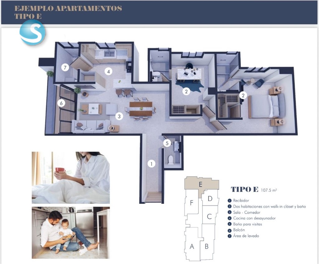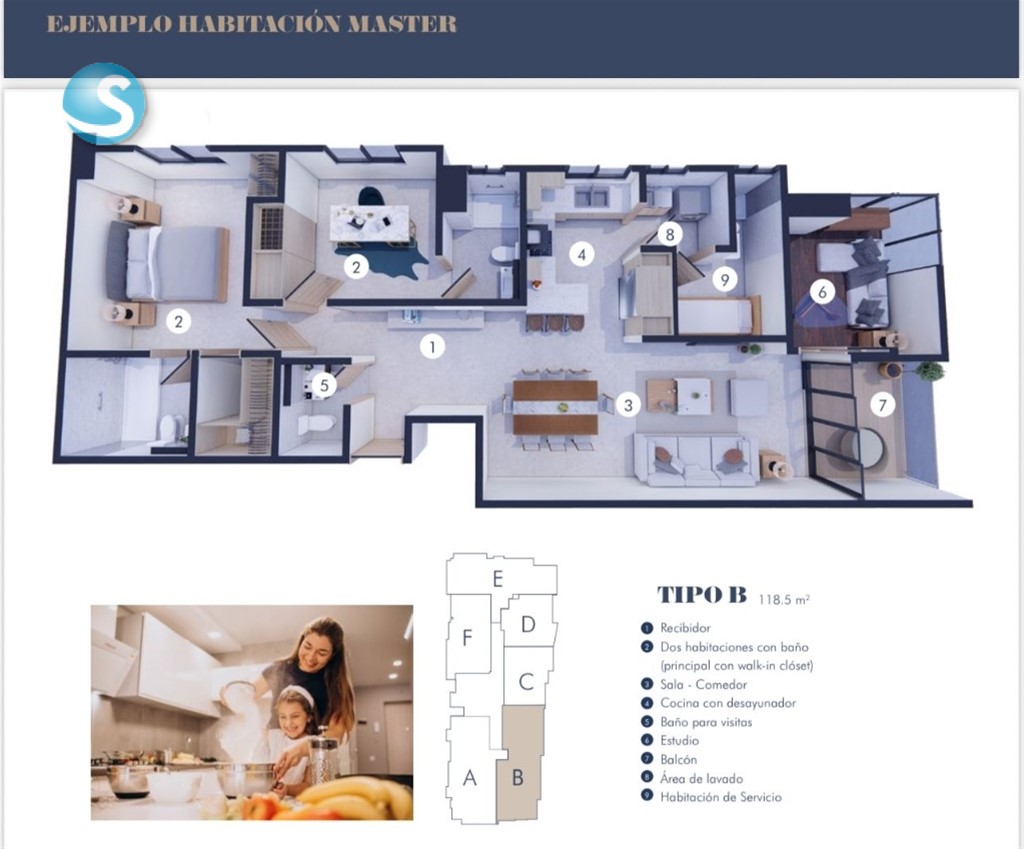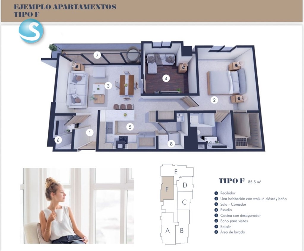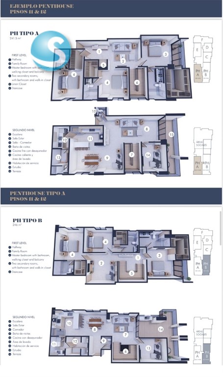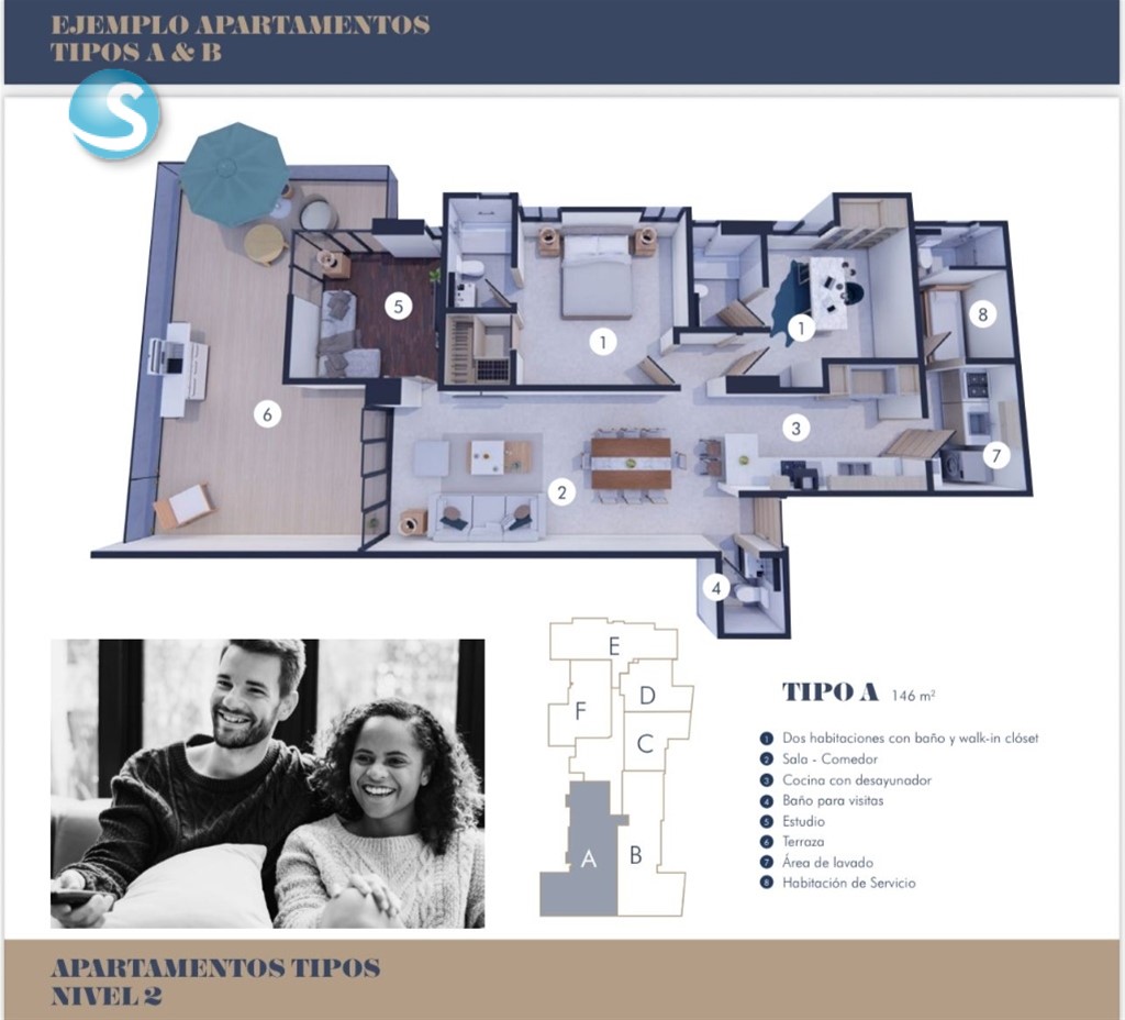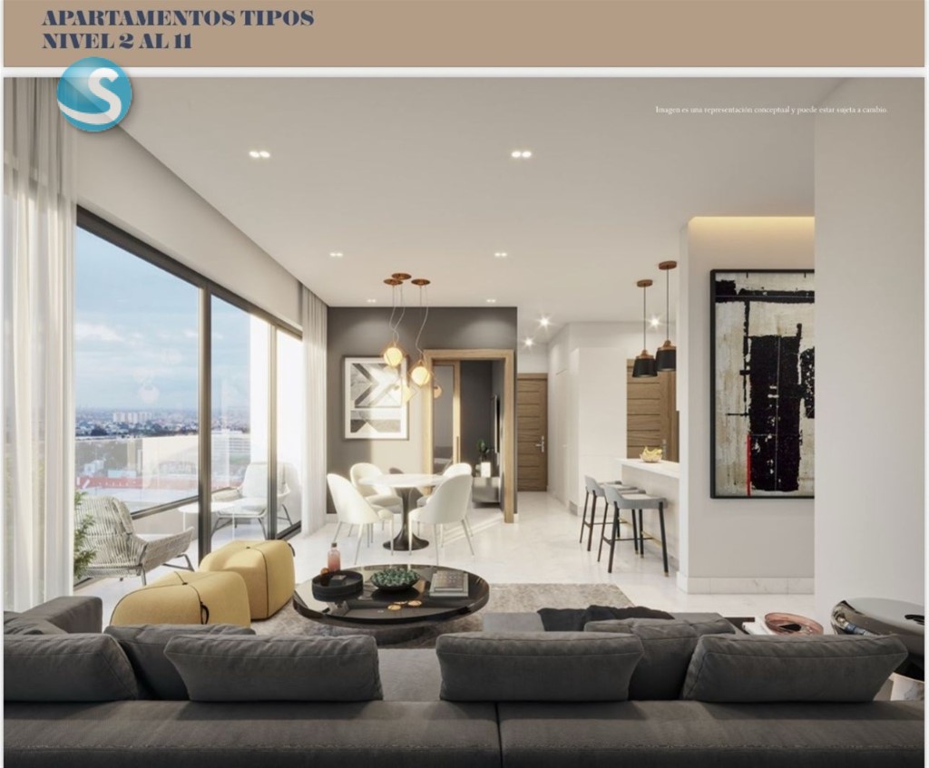 Excelente Proyecto de Apartamentos en el mismo corazón de Naco, contará con 10 plantas de apartamentos, las cuales conforman 58 apartamentos y 2 Penthouses. Apartamentos Tipo A - 146 mts2 - 2 habitaciones con baño y w/wcloset - Baño de visita - Sala/Comedor - Cocina con desayunador - Estudio - Terraza - Area de Lavado - Cuarto de Servicio Apartamentos Tipo A - 123 mts2 - 2 habitaciones con baño y w/wcloset - Baño de visita - Sala/Comedor - Cocina con desayunador - Estudio - Balcon - Area de Lavado - Cuarto de Servicio Apartamentos Tipo B - 118.5 mts2 - Recibidor - 2 habitaciones con baño, la principal con w/wcloset - Baño de visita - Sala/Comedor - Cocina con desayunador - Estudio - Balcon - Area de Lavado - Cuarto de Servicio Apartamentos Tipo C & D - 65 mts2 - 1 habitacion con baño y w/wcloset - Baño de visita - Sala - Cocina con desayunador - Balcon - Area de Lavado Apartamentos Tipo E - 107.5 mts2 - Recibidor - 2 habitaciones con baño y wcloset - Baño de visita - Sala/Comedor - Cocina con desayunador - Estudio - Balcon - Area de Lavado Apartamentos Tipo F - 85.5 mts2 - Recibidor - 1 habitacion con baño y wcloset - Baño de visita - Sala/Comedor - Cocina con desayunador - Estudio - Balcon - Area de Lavado PH TIPO A - 241.5 m2 PRIMER NIVEL Recibidor Family Room Habitación Máster con baño, walk-in clóset y balcón Dos habitaciones con baño y walk-in clóset Escalera SEGUNDO NIVEL Escalera Sala Estar Sala - Comedor Baño de visitas Cocina fría con desayunador Cocina caliente y área de lavado Habitación de servicio Estudio Terraza PH TIPO B - 246 mts2 PRIMER NIVEL Recibidor Family Room Habitación Máster con baño, walk-in clóset y balcón Dos habitaciones con baño y walk-in clóset Escalera SEGUNDO NIVEL Escalera Sala Estar Sala - Comedor Baño de visitas Cocina fría con desayunador Cocina caliente y área de lavado Habitación de servicio Estudio Terraza También contará con áreas sociales como gimnasio, jacuzzi, zona BBQ, salón de juego para niños, salón de fiestas. Precios de Venta: Desde US$ 170,000 - US$663,600 Forma de Pago: - Reserva: US$ 5,000 - Inicial: 20% - Durante la Construcción: 40% - Contraentrega: 40%