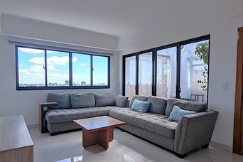 Apartamento tipo penthouse de 2 habitaciones, de 3 niveles ubicado en el exclusivo sector de Naco, en torre de lujo con amenidades DISTRIBUCIÓN: • 2do nivel Entrada, Sala, comedor, cocina, 1/2 baño, area de servicio con baño, area de lavado. • 1er nivel Amplia habitación principal con amplio walk in closet y baño, habitación secundaria con closet y baño, pasillo con area de trabajo con escritorio • 3er nivel, amplio family room y terraza de 20 mts, 1 baño completo 2 parqueos 192 M2 CARACTERSITICAS DE LA TORRE: - Lobby de Lujo - 2 Ascensores - Sport Bar - Gimnasio - Salon Multiusos Precio alquiler US$2,100 amueblado Precio para la venta US$350,000 (sin muebles)