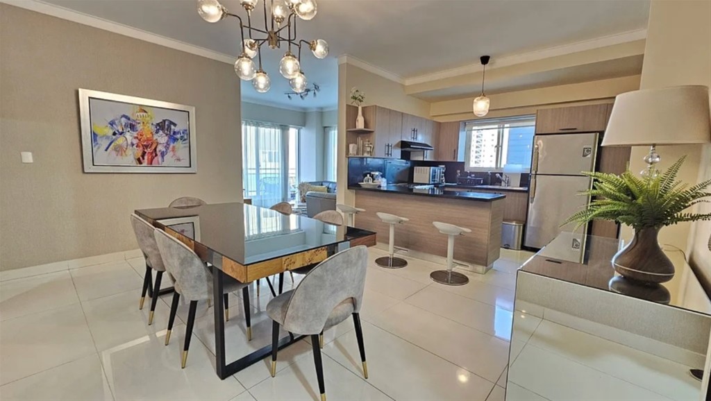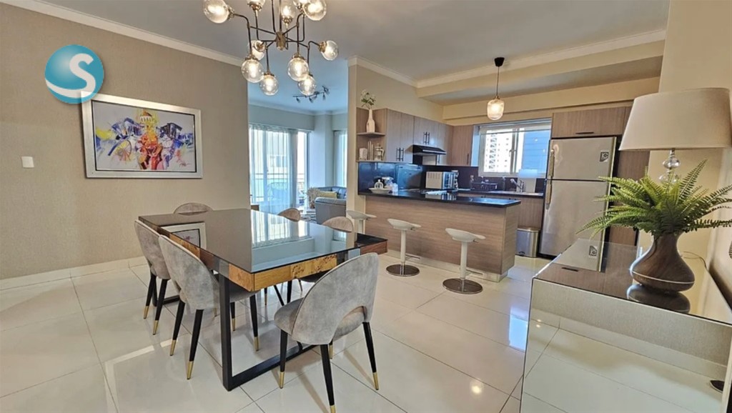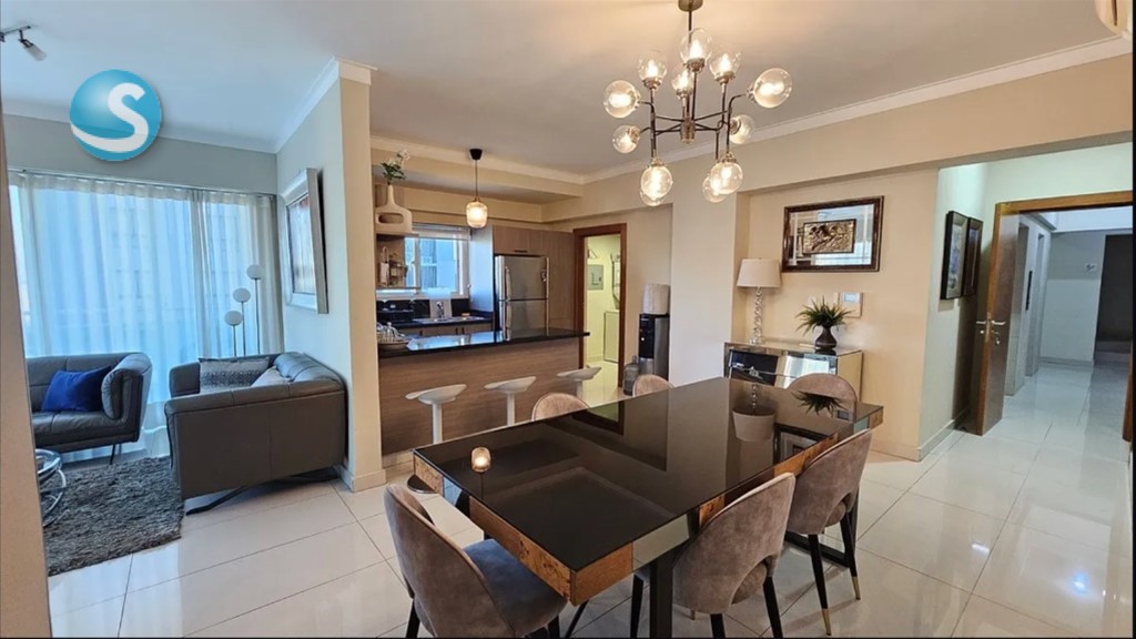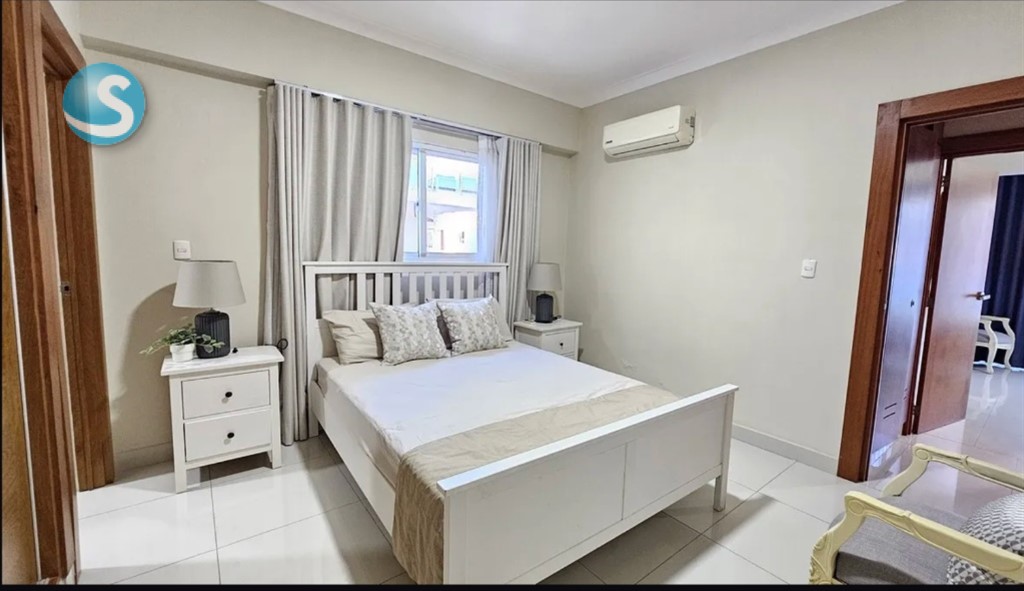 Descripción Este apartamento amueblado en venta está ubicado en Naco, uno de los sectores residenciales más consolidados y demandados de Santo Domingo. Su amplitud, distribución funcional y estado actualizado lo convierten en una excelente opción tanto para vivir como para invertir. Cuenta con un metraje total de 167.88 m² y un metraje neto de 142.57 m², distribuidos de manera cómoda y bien aprovechada. Dispone de dos habitaciones, cada una con su baño y clóset, además de un baño de visitas. La sala y el comedor son espaciosos y conectan con dos balcones amplios en L, que aportan ventilación, luz natural y la posibilidad de ampliar el área social. La cocina fue recién remodelada, con menos de un año de uso, tope en cuarzo y línea blanca integrada, incluyendo estufa y horno empotrados. El apartamento también cuenta con un área de lavado independiente y un cuarto de servicio con su baño, ambos de buen tamaño. Características del apartamento: Metraje total: 167.88 m² Metraje neto: 142.57 m² Apartamento amueblado 2 habitaciones con baño y clóset 2.5 baños Sala Comedor Cocina recién remodelada con tope en cuarzo Estufa y horno empotrados incluidos Área de lavado Cuarto de servicio con baño 2 balcones amplios en L, con opción de ampliar la sala 2 parqueos Locker La propiedad se encuentra en una torre residencial bien mantenida, con áreas comunes recientemente remodeladas y amenidades completas que aportan comodidad y seguridad. Características y amenidades de la torre: Torre de 12 niveles de apartamentos 4 niveles de estacionamientos soterrados 2 ascensores Planta eléctrica full Planta eléctrica de emergencia para áreas comunes esenciales Lobby amplio, climatizado y recién remodelado Gimnasio Piscina Sistema de seguridad con cámaras en acceso principal Portones automáticos con control remoto Gas común Cisterna con doble fuente de alimentación de agua Bomba principal y bomba de emergencia Estar de choferes con baño Sistema contra incendios Depósito de basura designado Una excelente oportunidad para quienes buscan un apartamento amplio y amueblado en Naco, dentro de una torre con amenidades completas, buena distribución y una ubicación estratégica que garantiza comodidad y valorización a largo plazo.