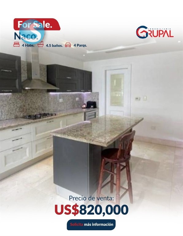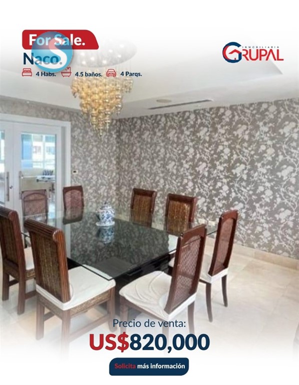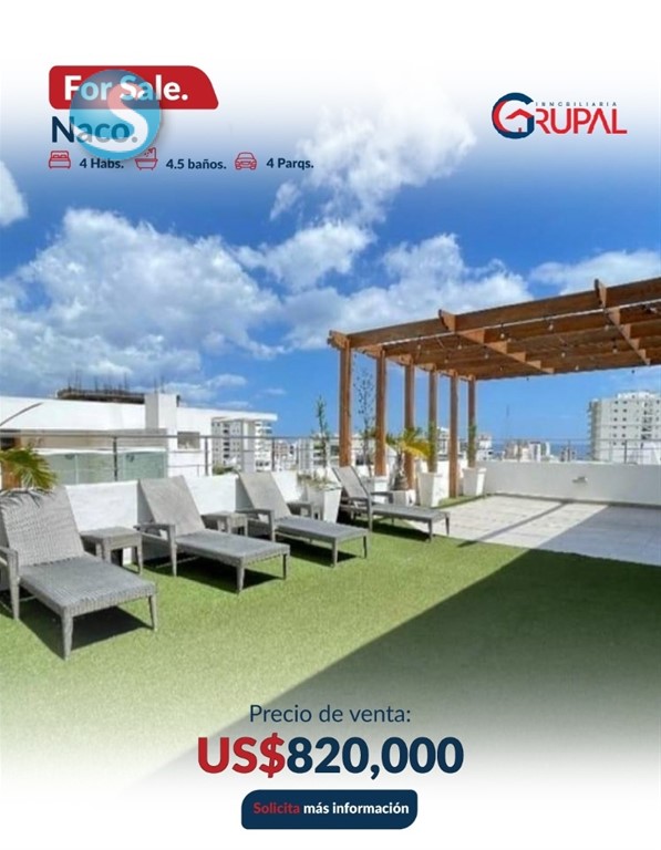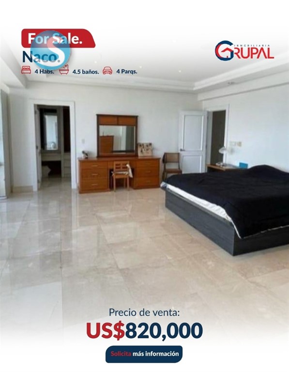 Espectacular apartamento en piso alto en Naco. ?????????????????????????????? ?????? ?????????????????????? 4 habitaciones Habitación principal amplia con entrada de luz natural Walking closet y baño 3 habitaciones secundarias, c/u con baño y walking closet Recibidor privado Baño de visita Amplia sala con vista panorámica Comedor cerrado con dos puertas de acceso Estudio equipado con bar Family Room frente a las habitaciones Cocina amplia y equipada Electrodomésticos empotrados: 2 neveras y ,1 freezer, estufa empotrada con campana y extractor Área de lavado Habitación de servicio con baño 4 parqueos paralelos Locker ?????????????????????????????? ?? ???????????????????? ???? ???? ?????????? Lobby climatizado Terraza con barbacoa y jacuzzi Salón multiuso climatizado y amueblado Bar Gimnasio completo climatizado Sauna Seguridad 24 horas Cámaras de seguridad Área para choferes ???????????? ???? ?????????? US$820,000