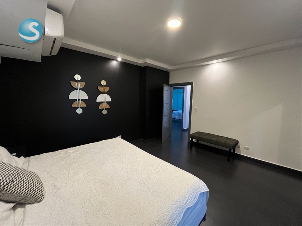 Acogedor apartamento amueblado en alquiler en alquiler en Naco en calle tranquila. 1 apartamento por nivel 175m2, 3er piso, 3 habitaciones con su baño, principal con wc, amplio balcon frontal, sala, comedor, estar , cocina cerrada, area de lavado, habitacion de servicio, 2 parqueos techados lineal. Facilidades: Lobby, 1 ascensor, planta full, gas comun, conserje, porton electrico, intercom, mantenimiento incluido. Se puede emitir comprobante fiscal + itbis