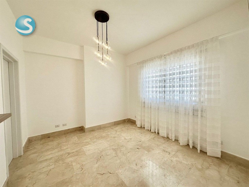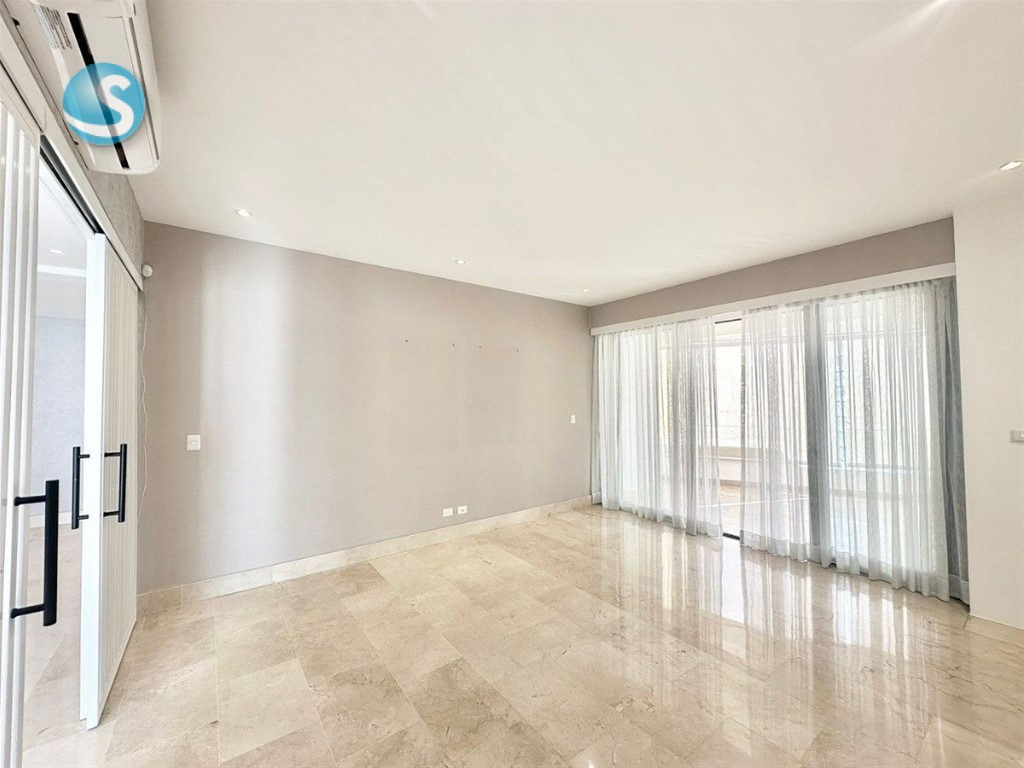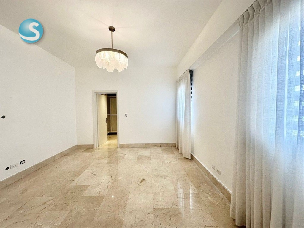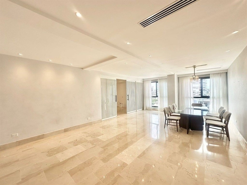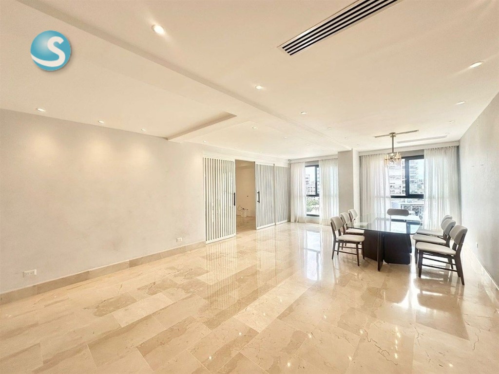Amplio y elegante apartamento en alquiler ubicado en torre exclusiva 270 mts totales 234 mts netos 3 habitaciones con walk-in closet Tres (3.5) baños Family room Estudio Sala Comedor Cocina fría Área de lavado Habitación de servicio con su baño Balcón con vista a la ciudad Tres (3) parqueos techados Un (1) locker Pisos en mármol Dos (2) ascensores Gas común Amenidades de la torre: Lobby climatizado Gimnasio Área infantil Salón de eventos Terraza destechada Planta eléctrica full Seguridad 24 horas Cámaras de vigilancia Cuarto para choferes Pozo tubular Doble bomba de agua Sistema de filtración de agua Precio de alquiler US$4,300.00 Mantenimiento incluido Incluye línea blanca + aires acondicionados