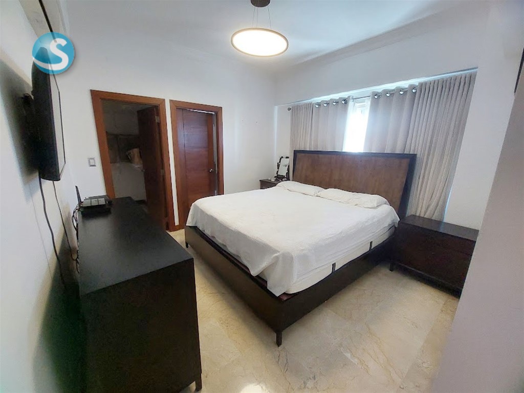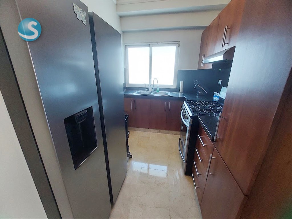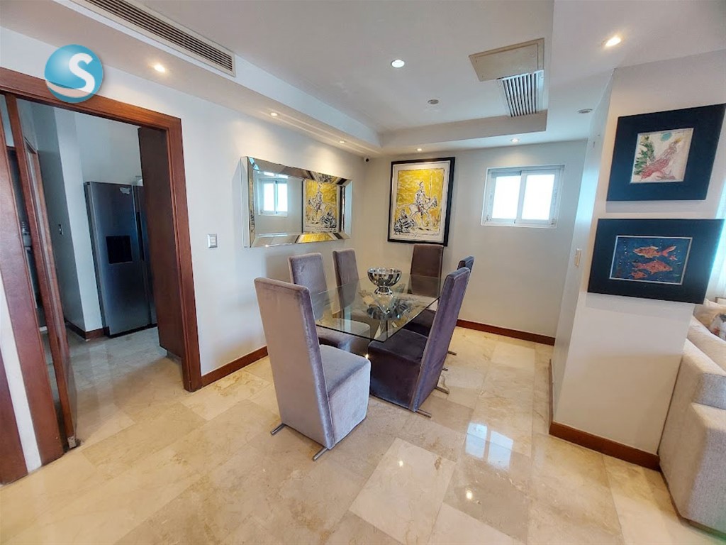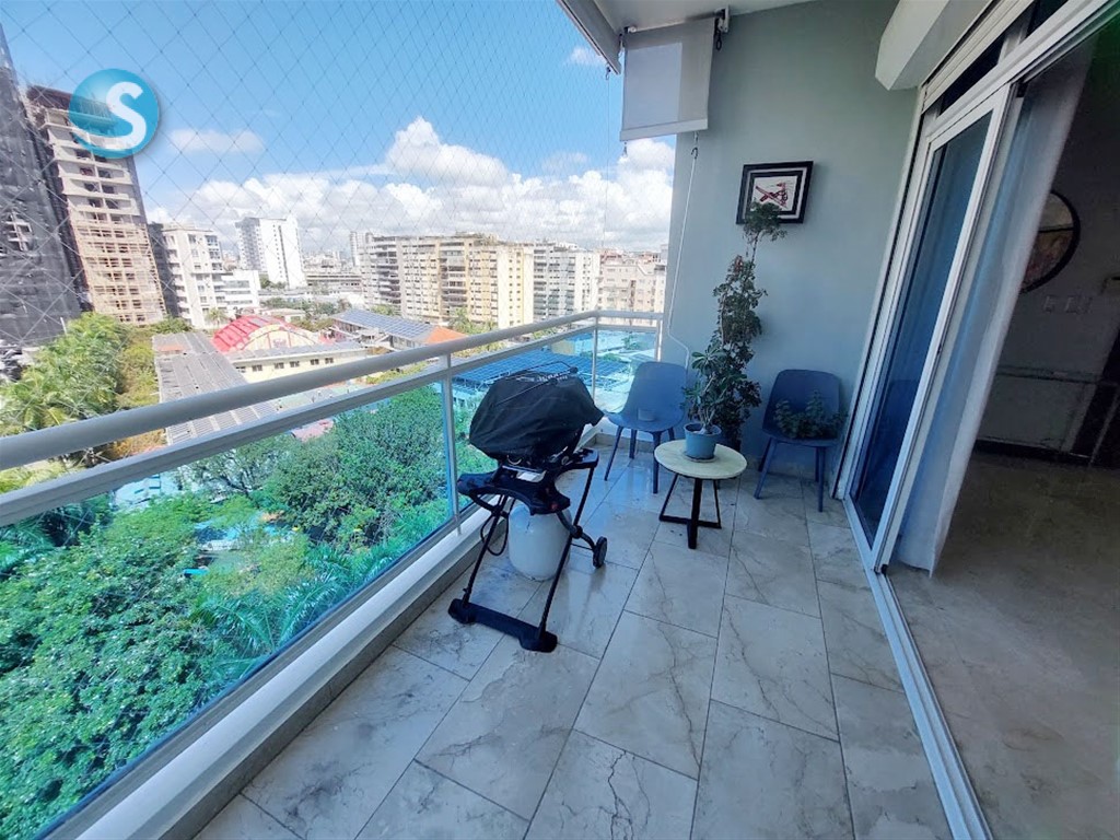 Amplio apartamento amueblado de 2h, 2.5b, en piso 7 con balcón grande, sala, comedor, estar familiar, cocina, área de lavado, cuarto de servicio, 2 parqueos techados y locker. Cuenta con mallas de seguridad en el balcón y ventanas, así como shutter en balcón. Tiene techos en yeso con luces empotradas en sala y comedor, ypisos en mármol. La torre cuenta con lobby, ascensor, área social en el último piso con terraza con jacuzzi, gimnasio, salón para eventos, segunda terraza destechada, área para BBQ y baños para damas y caballeros. Es la opción para vivir cerca de todo, con todas las comodidades y servicios próximos. Contáctame!!