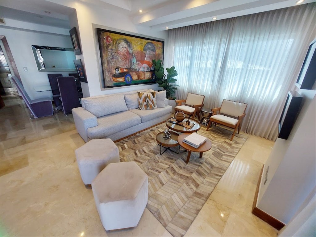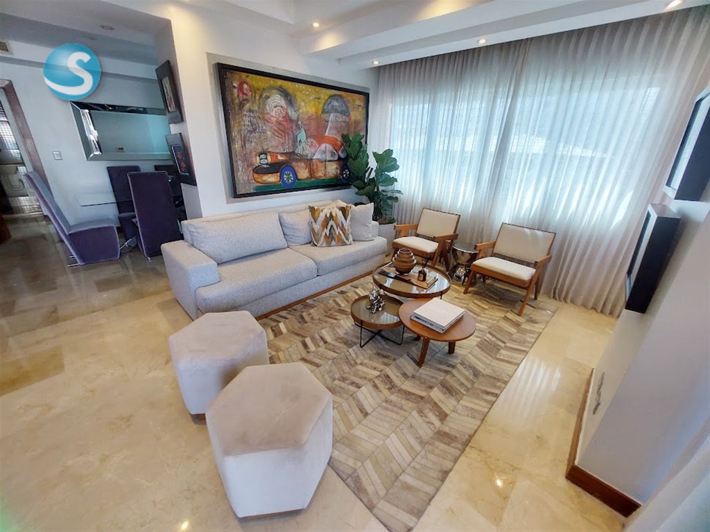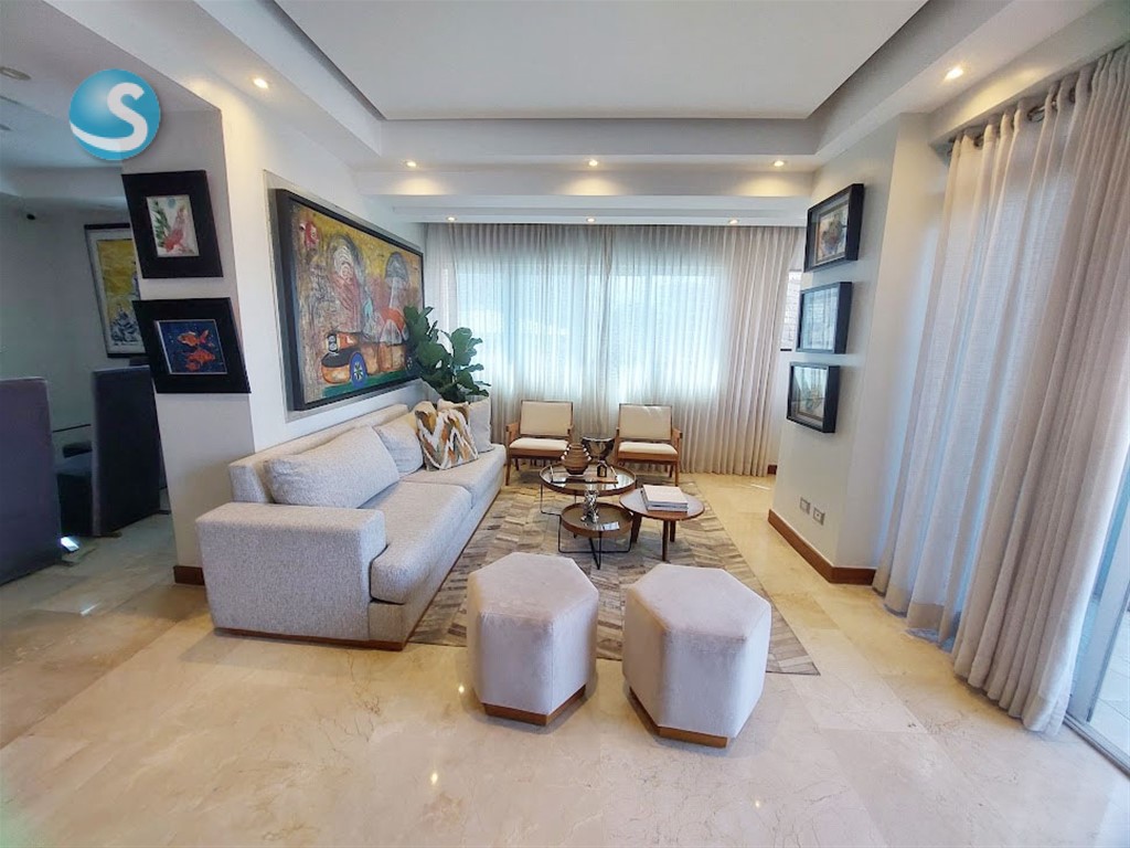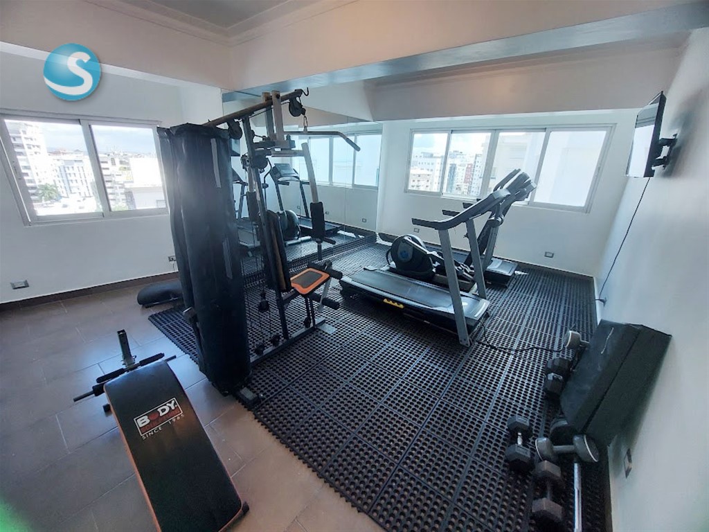 Amplio apartamento amueblado de 2h, 2.5b, en piso 7 con balcón grande, sala, comedor, estar familiar, cocina, área de lavado, cuarto de servicio, 2 parqueos techados y locker. Cuenta con mallas de seguridad en el balcón y ventanas, así como shutter en balcón. Tiene techos en yeso con luces empotradas en sala y comedor, ypisos en mármol. La torre cuenta con lobby, ascensor, área social en el último piso con terraza con jacuzzi, gimnasio, salón para eventos, segunda terraza destechada, área para BBQ y baños para damas y caballeros. Es la opción para vivir cerca de todo, con todas las comodidades y servicios próximos. Contáctame!!