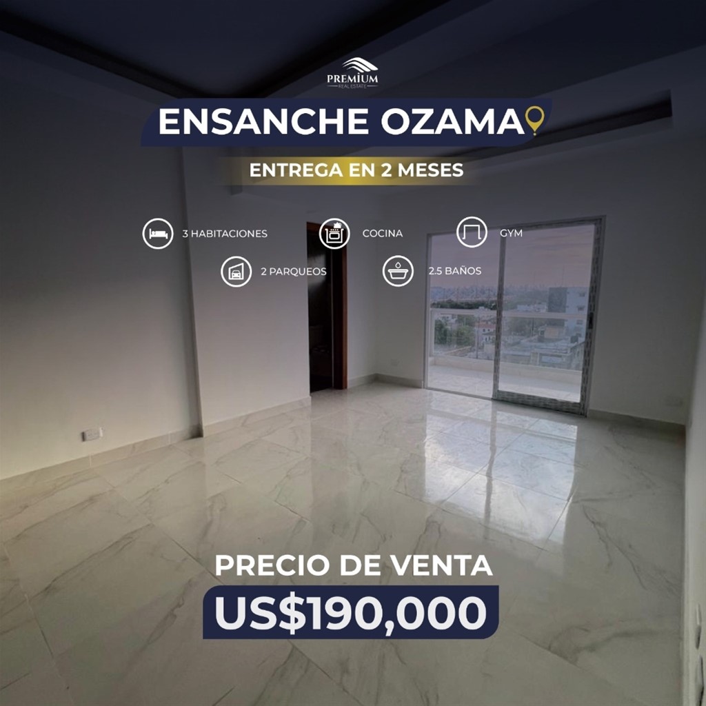 Ensanche Ozama?? Última unidad disponible para entrega en 2 meses. 140 metros Balcón amplio 3 hab 2.5 baños Sala Comedor Cocina Área lavado 2 parqueos Amenidades de la Torre Lobby Seguridad Circuito de cámaras Sistema contra incendios Área de gazebo Área juego Piscina tipo jacuzzi Gym ascensor Planta Depurador de Agua Precio 190 mil usd