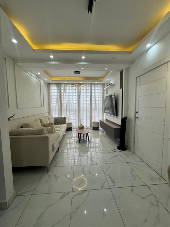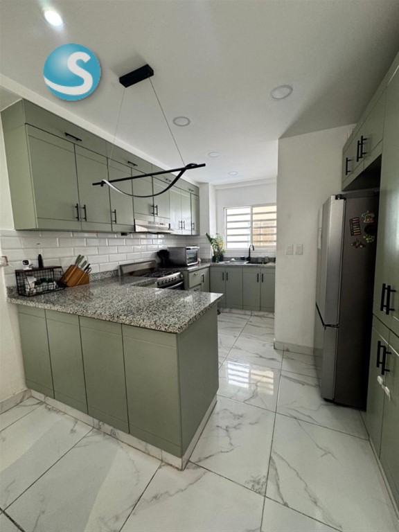 Ensanche Ozama. Apartamento de 90 metros cuadrados en cuarto nivel, totalmente remodelado con acabados de nivel superior. Detalles de la propiedad: • 2 habitaciones; la principal con baño privado y clóset de pared a pared. • Baño secundario completo con grifería moderna. • Cocina de diseño europeo con topes de granito, desayunador y revestimiento contemporáneo. • Sala y comedor de concepto abierto con techos en sheetrock e iluminación LED indirecta. • Pisos de porcelanato de gran formato en áreas sociales y laminados en habitaciones. • Área de lavado independiente y clóset de ropa blanca. Infraestructura y seguridad: • 1 parqueo techado de fácil acceso. • Sistema de intercom y portón eléctrico. • Gas común y servicio de conserjería. Precio de venta: RD$7,600,000. Unidad lista para entrega, ideal para inversión de renta inmediata debido a su estado impecable y ubicación estratégica en el sector.