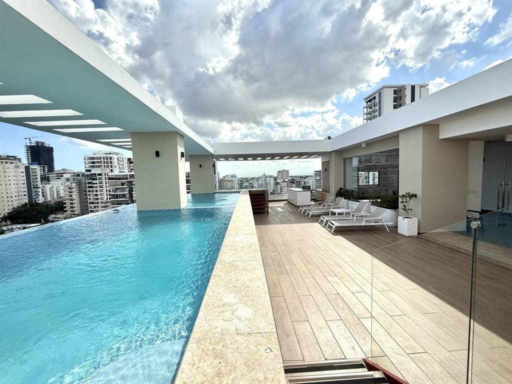 ENSANCHE PARAISO Acogedor Apartamento en Moderna Torre con maravillosas Áreas Sociales en el último nivel, a pasos de la Av. Lincoln. TOTALMENTE AMUEBLADO US$220,000 * 94 metros neto * 2 habitaciones c/u con baño * Medio baño de visitas * Sala * Comedor * Balcón * Cocina * Área de lavado * Cuarto de servicio con baño * 2 parqueos paralelos Amenidades: Piscina Gimnasio equipado Salon Multiuso Área infantil Cine Lobby finamente amueblado Dos (02) Ascensores última generación Drive Way