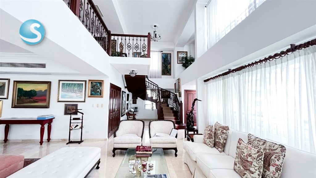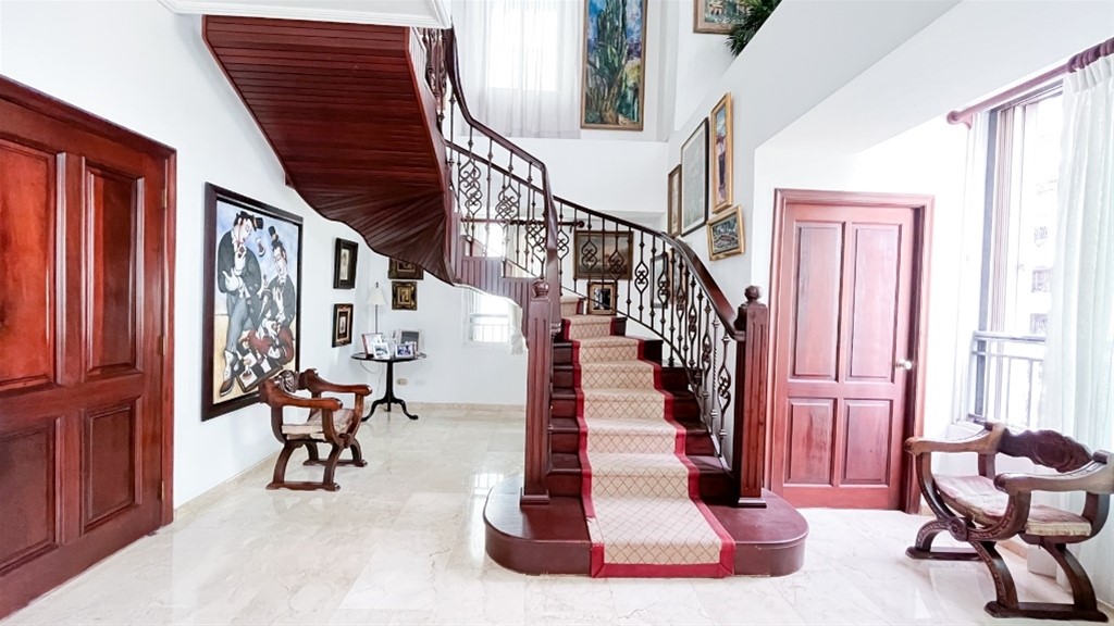Características de la Zona – Ensanche Paraíso, Santo Domingo Ubicado en una de las zonas más céntricas y demandadas del Distrito Nacional, el Ensanche Paraíso ofrece un entorno residencial de clase media alta, ideal para familias y ejecutivos que buscan confort, seguridad y cercanía a todo. Rápido acceso a las avenidas Winston Churchill, Abraham Lincoln y Gustavo Mejía Ricart. A pocos minutos de Ágora Mall y Galería 360, blue mall con amplia oferta comercial y gastronómica. Cercanía a supermercados, bancos, farmacias, colegios y centros médicos. Zona con buena conectividad, transporte público accesible y servicios básicos estables. Alta plusvalía y entorno con desarrollo constante de torres residenciales modernas. Características del Apartamento – Condominio Torre Jerez Elegante apartamento de dos niveles, con 619 m² de construcción, finos acabados y excelente distribución: Amplia sala con doble altura y grandes ventanales que aportan luz natural. Pisos en mármol y parquet, techos con cornisas de yeso y plafones decorativos. 3 habitaciones principales, cada una con baño privado y walk-in closet en cedro. 5 baños y 2 medios baños, con topes en mármol y aparatos sanitarios de lujo. Cocina modular en caoba, con desayunador y meseta de granito natural. Sala familiar, estudio, biblioteca y comedor formal. Escalera interna en caoba con detalles en hierro ornamental. Lobby privado y terrazas integradas, ideales para recibir visitas. Área común con patio y jardinería, que aporta frescura y espacios verdes. 5 parqueos paralelos con pisos en hormigón estampado. Torre con ascensor, portón eléctrico, planta eléctrica full, cisterna e intercom. Construcción sólida en bloques de hormigón armado, en excelente estado de conservación.