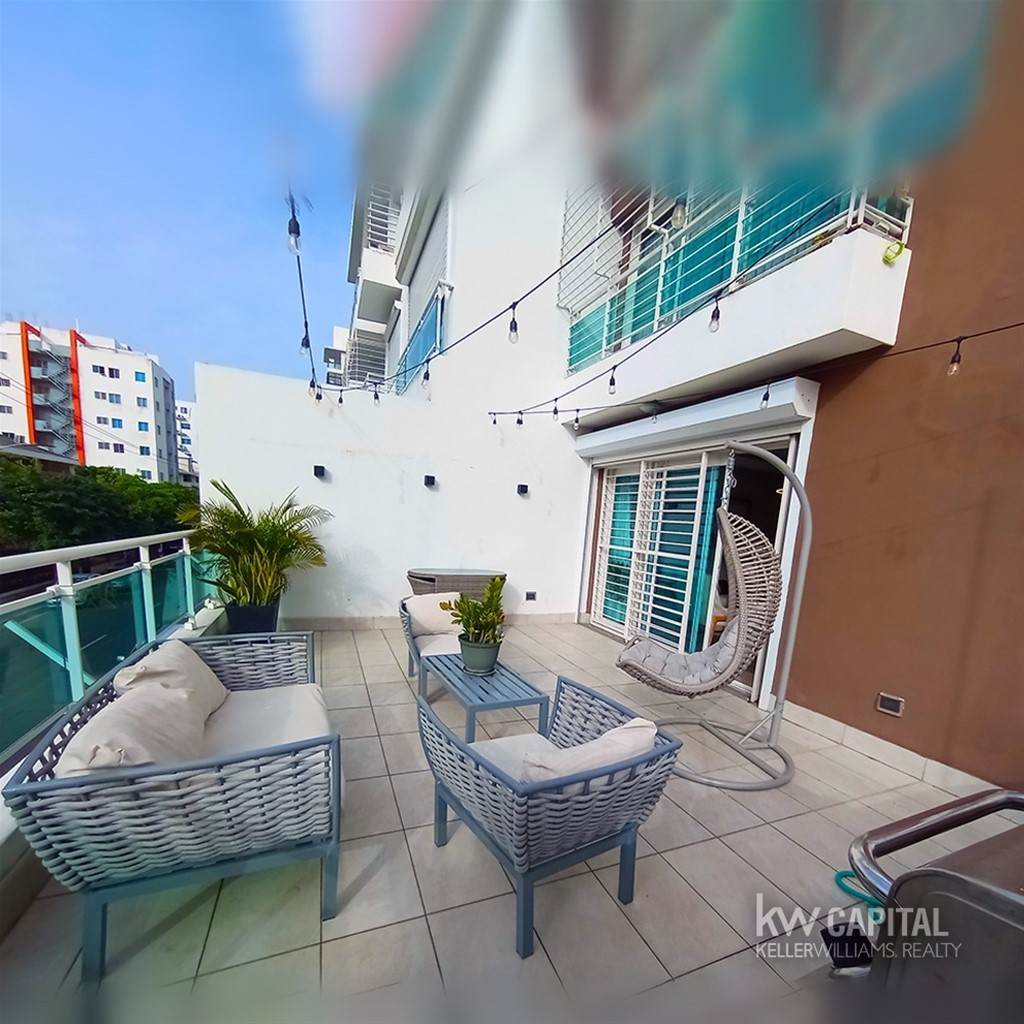 Apartamento en venta, 2da con Terraza, en Evaristo Morales CARACTERÍSTICAS - 155 mts2 totales -102 M2 de apartamento + Terraza (29.17 metros) - 2do piso - 2 Habitaciones cada uno con su baño - Baño de visita - Cocina cerrada - Sala/Comedor - Estudio - Área de lavado - Cuarto de servicio - Shutters - 2 parqueos lineales ?SOBRE LA TORRE: - Lobby - Área social con terraza y Gimnasio - Ascensor Moderno - Gas común - Planta Full $240,000.00 (USD) Mantenimiento RD$11,350.00 Sugeiley Ozuna (809) 885-0795 Kw Capital