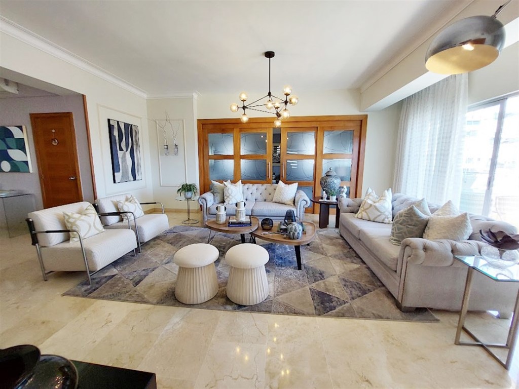 Bellísimo apartamento en piso 8 en torre de un solo apartamento por nivel de estilo moderno y hermosos acabados y sólo 9 vecinos. Consta de 3 habitaciones, 3 baños y medio, recibidor, sala, comedor, estudio, balcón amplio, 2 parqueos techados y locker. Disfrute de un balcón con vistas, un recibidor elegante, sala y comedor amplios y una cocina moderna. Terminación de primera con pisos en mármol y madera preciosa en puertas, marcos y gabinetes de la cocina. Sus 3 habitaciones de gran tamaño y walk-in closets forrados en madera preciosa. La torre cuenta con lobby de lujo, estar para choferes, ascensor, dos plantas eléctricas, portón eléctrico, dos conserjes en el día y uno de noche. Si buscas una torre con pocos vecinos y toda la comodidad y lujo a tu alcance, este es tu apartamento! Contáctame Mery López 829-584-4085