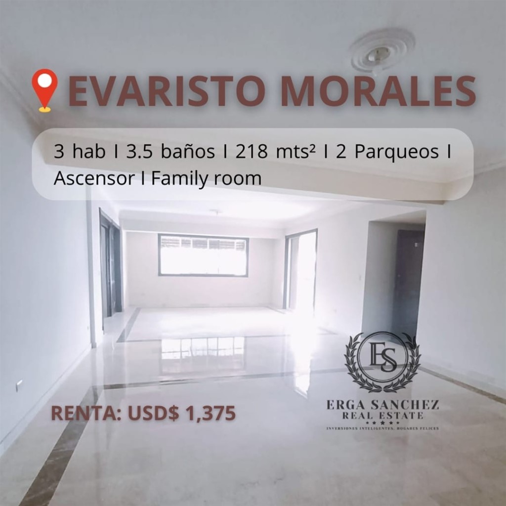 En RENTA AMPLIO APARTAMENTO en el corazón de EVARISTO MORALES CARACTERISTICAS Y AMENIDADES: Súper amplia sala y comedor Espaciosa cocina 3 habitaciones 3.5 baños Ascensor Planta full 2 parqueos Family room Área de lavado Cuarto de servicio Gas común con medidor RENTA: USD$ 1,375.00 (incluye mantenimiento 2 depósitos y 1 mes adelantado).