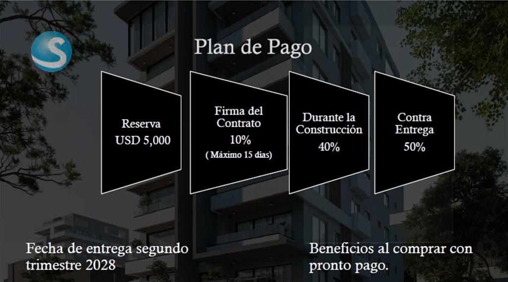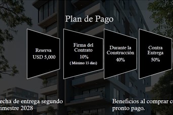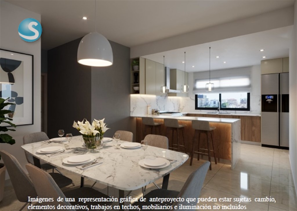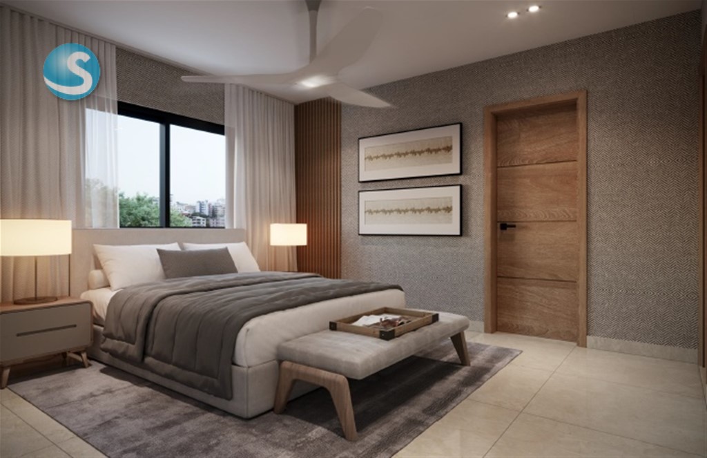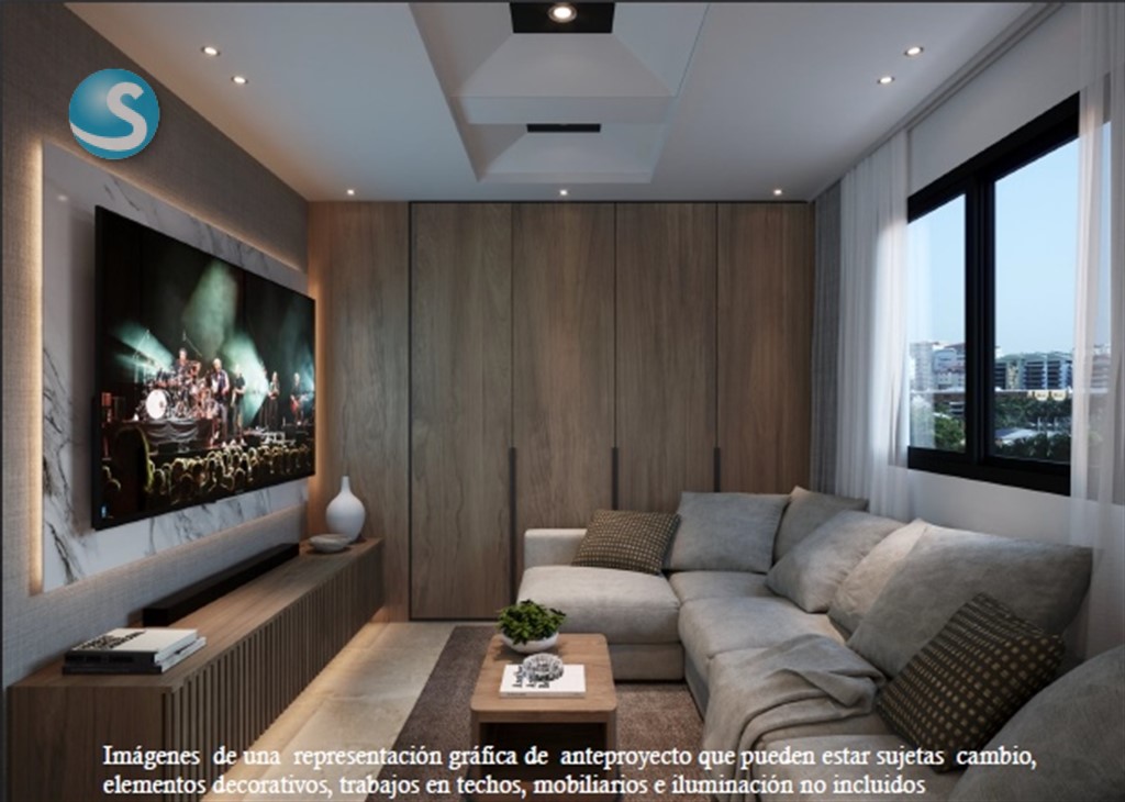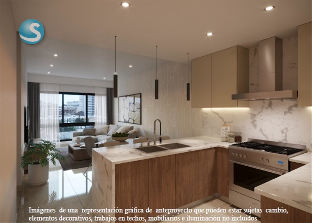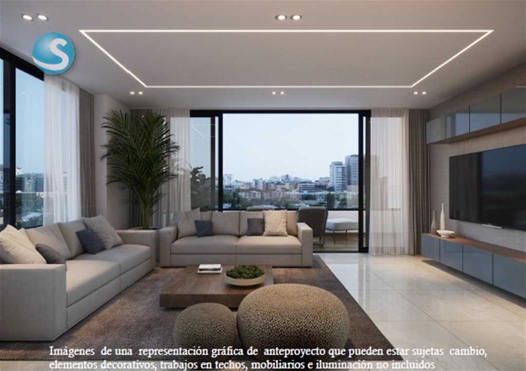Exclusivo proyecto de apartamentos ubicado en la zona de Evaristo Morales, consta de 2 niveles de parqueos y siete niveles de apartamentos y en el octavo nivel el área social con vista espectacular a la ciudad de Santo Domingo Apartamentos tipo del nivel 2 al 7: A - 77 Mts - 1 habitación + estudio, 2 baños B - 144 Mts - 3 habitaciones, 3.5 baños, habitación de servicio C - 74 Mts - 1 habitación + estudio, 2 baños Nivel 8: A - 77 Mts - 1 habitación + estudio, 2 baños B - 190 Mts - 3 habitaciones + estudio, 4.5 baños, hab de servicio + terraza 33.81 mts C - 143 Mts - 3 habitaciones, 3 baños, habitación de servicio +terraza 40.90 Mts Espacios y amenidades de la torre : Recibidor amueblado Lobby climatizado Gimnasio equipado Salón social multiuso amueblado y climatizado Terraza destechada con Jacuzzi y BBQ Área infantil Ascensor Planta eléctrica full Cámaras de seguridad Video intercom y portones eléctricos. Terminaciones: Puertas importadas Cocinas modulares Tope en Granito natural Pisos en porcelanato Baños en cerámica o porcelanato importado Pre instalación de aires Calentador de línea Preinstalación de shutters