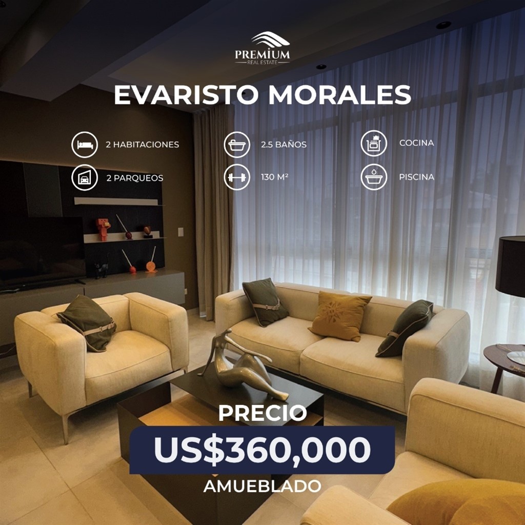 Evaristo Morales! Amueblado 130 mt2 2 habitaciones / balcón 2.5 baños Sala Comedor Cocina Cuarto de servicio 2 parqueos 2 nivel Área social Piscina Jacuzzis Área de niños Terrazas Área de trabajo Lounge Precio de venta amueblado US$360,000