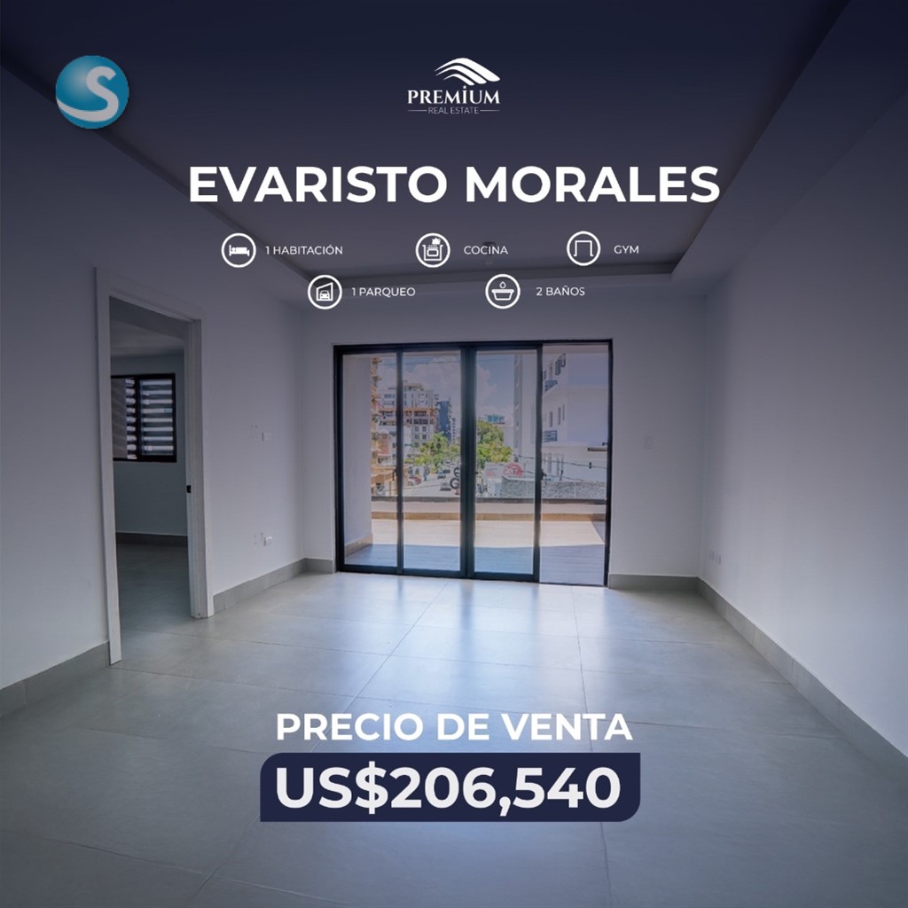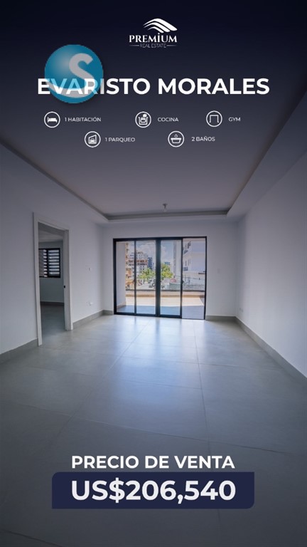Evaristo Morales, torre familiar A estrenar 2do nivel 70mts + 34 de terraza 1 habitación con W/C 2 baños completos Sala/Comedor Cocina Área de lavado 1 parqueo Amenidades: Lobby amueblado y climatizado 2 ascensores Área de juegos para niños Terraza techada y destechada Picuzzi Salón de reuniones Áreas de BBQ Sauna Gimnasio Petground Precio de venta: US$206,540