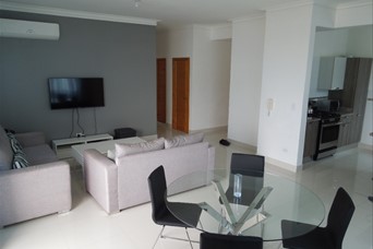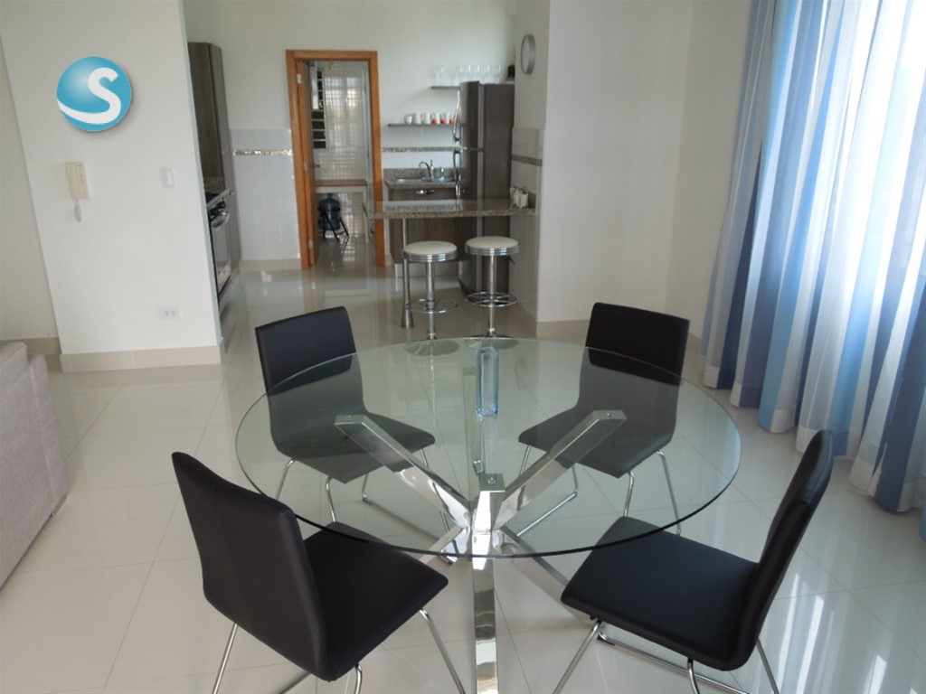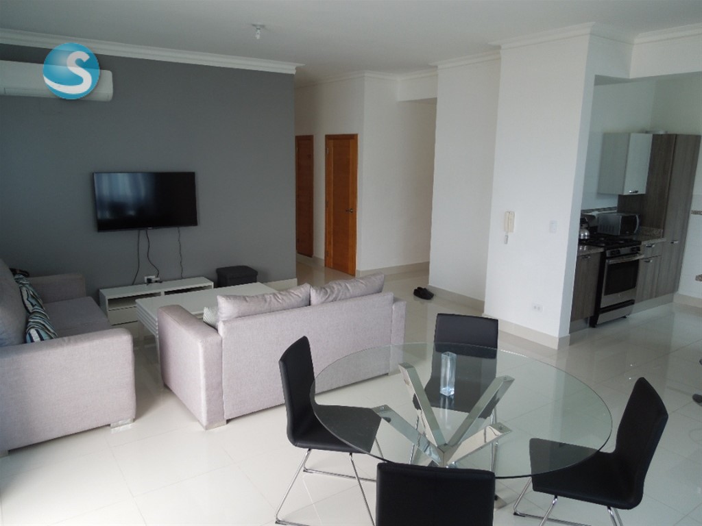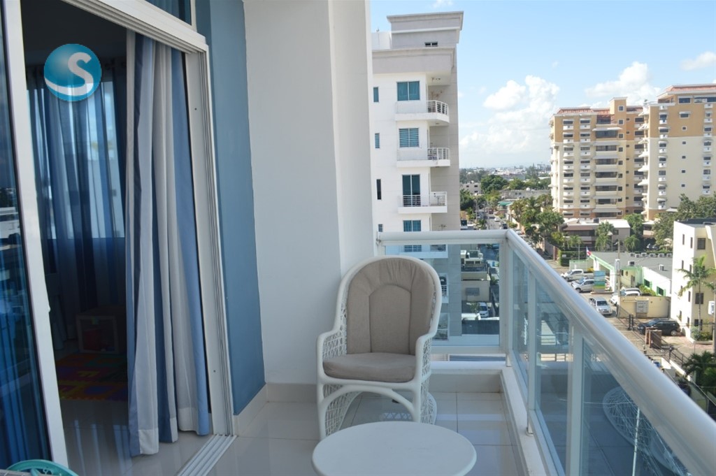 Apartamento moderno y amueblado en excelente zona de Evaristo Morales, con áreas sociales con gimnasio y terraza común, cerca de principales Avenidas como Winston Churchill y 27 de Febrero. Piso 6 2 Habitaciones con sus baños * Sala-comedor * Cocina con desayunador * Balcón * Baño de visita * Area de lavado * Cuarto de Servicio Areas sociales con gimnasio y terraza techada y destechada común Ascensor * Planta full * Seguridad 24 horas * Lobby * 2 parqueos techados * Calentador de gas * Gas común Inversión mensual completamente amueblado (en las fotos le faltan algunos muebles que se le colocarán nuevos) US$1,000.00 mantenimiento incluido Más información y visitas Megumi Matsunaga 829-630-4846