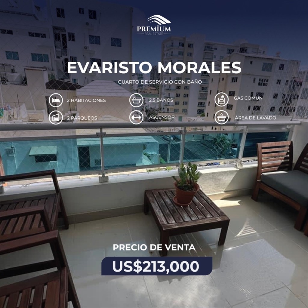 Evaristo Morales Nivel 5 145mts 2 Habitaciones 2.5 Baños Sala Comedor Balcón Cocina Área de lavado Cuarto de servicio con baño 2 Parqueos (1 Techado otro NO) Planta Full Gas Común Ascensor Mantenimiento RD$8,000 Precio US$213000