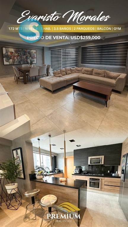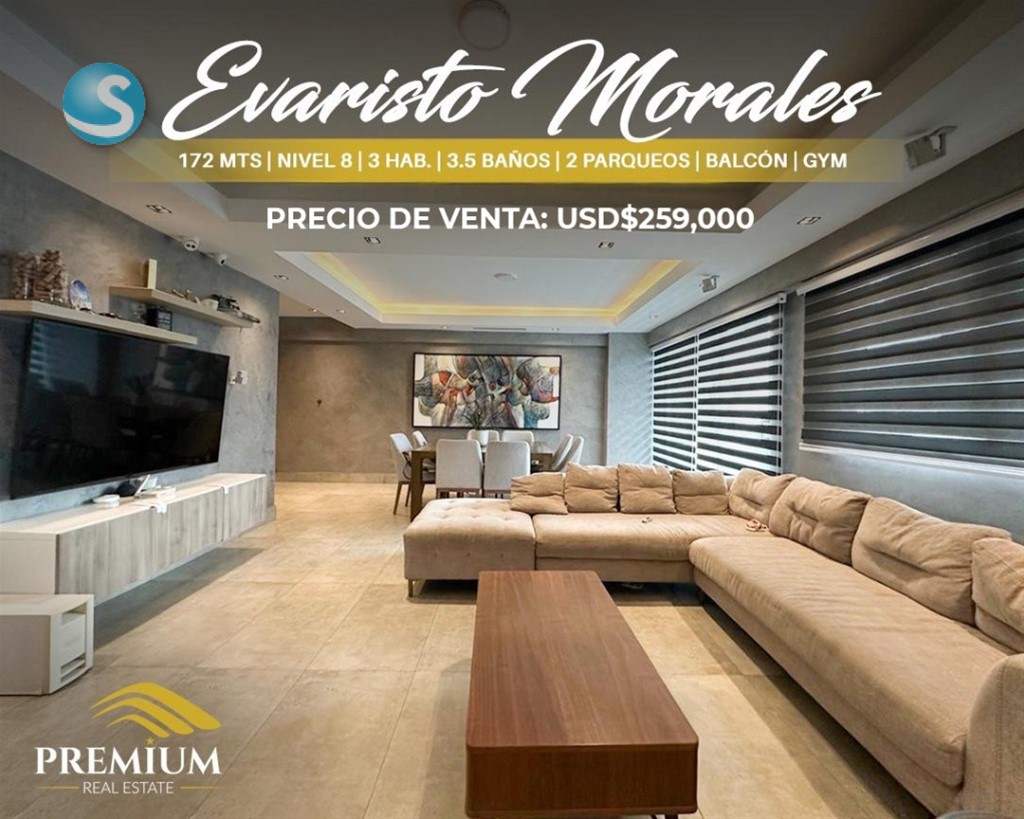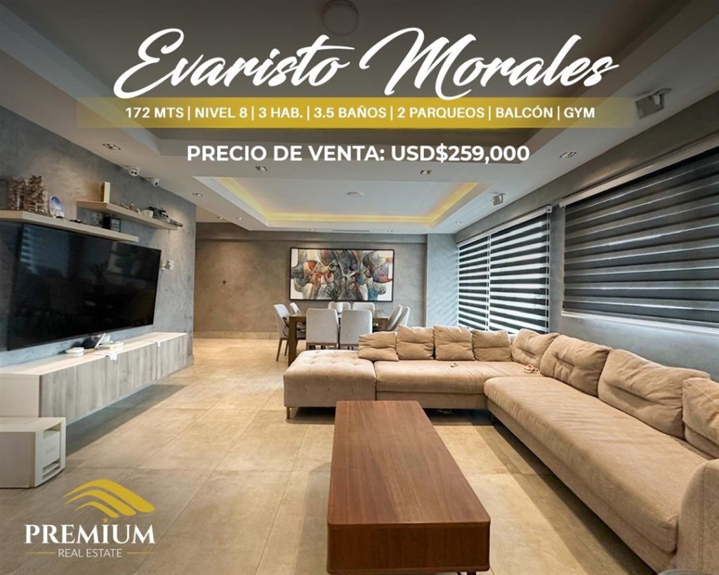 Evaristo Morales 3 Habitaciones 3.5 Baños Sala-Comedor Cocina Área de lavado Cuarto de servicio con baño 2 parqueos techados Gym Locker 172 mts 8vo nivel Precio US$259,000 Mantenimiento RD$12,500