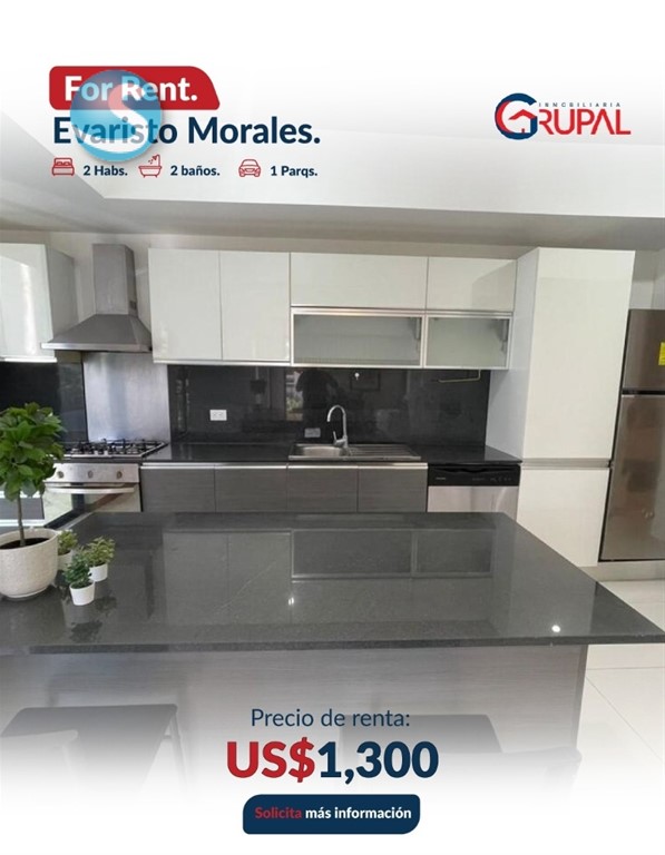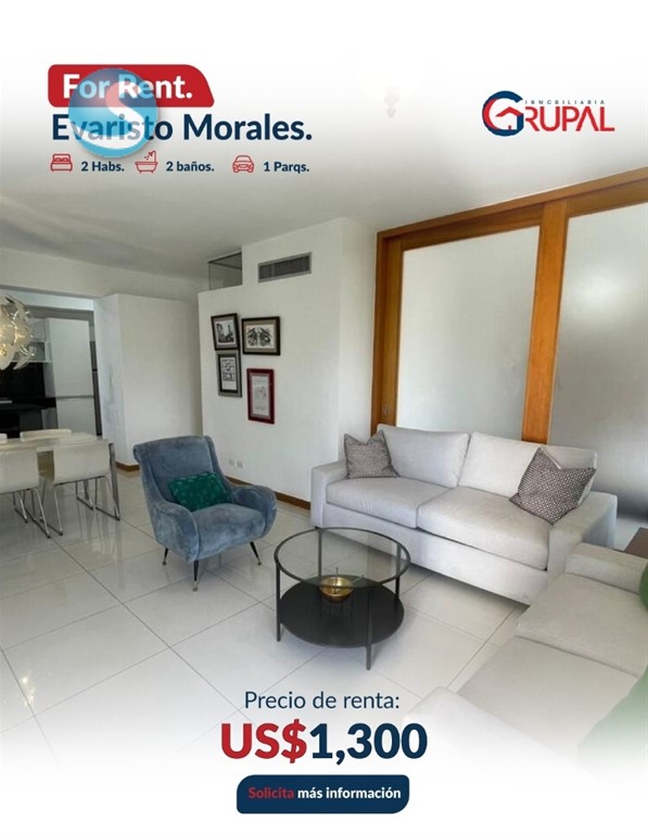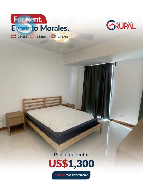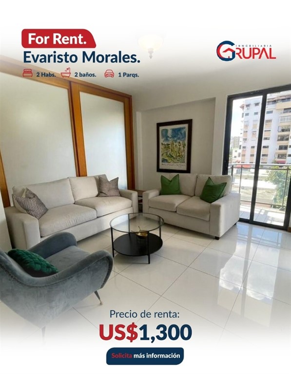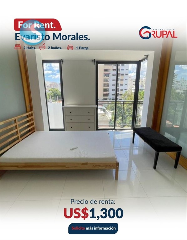Alquiler en exclusivo sector de Evaristo Morales?? ?????????????????????????????? ?????? ?????????????????????? ?2 habitaciones ?2 baños ?Sala ?Comedor ?Cocina ?Closet de ropa blanca ?Balcón ?Área de lavado ?Habitación de servicio ?1 parqueo ?????????????????????????????? ???? ???? ?????????? ??Portón eléctrico ??Ascensor ??Luz 24 hrs ??Cámaras de seguridad ??Planta full ??Gimnasio ??Salón Multiuso ??Lobby ??Gas común ???????????? ???? ???????????????? US$1,300???? ? Información: ? 829-683-2675