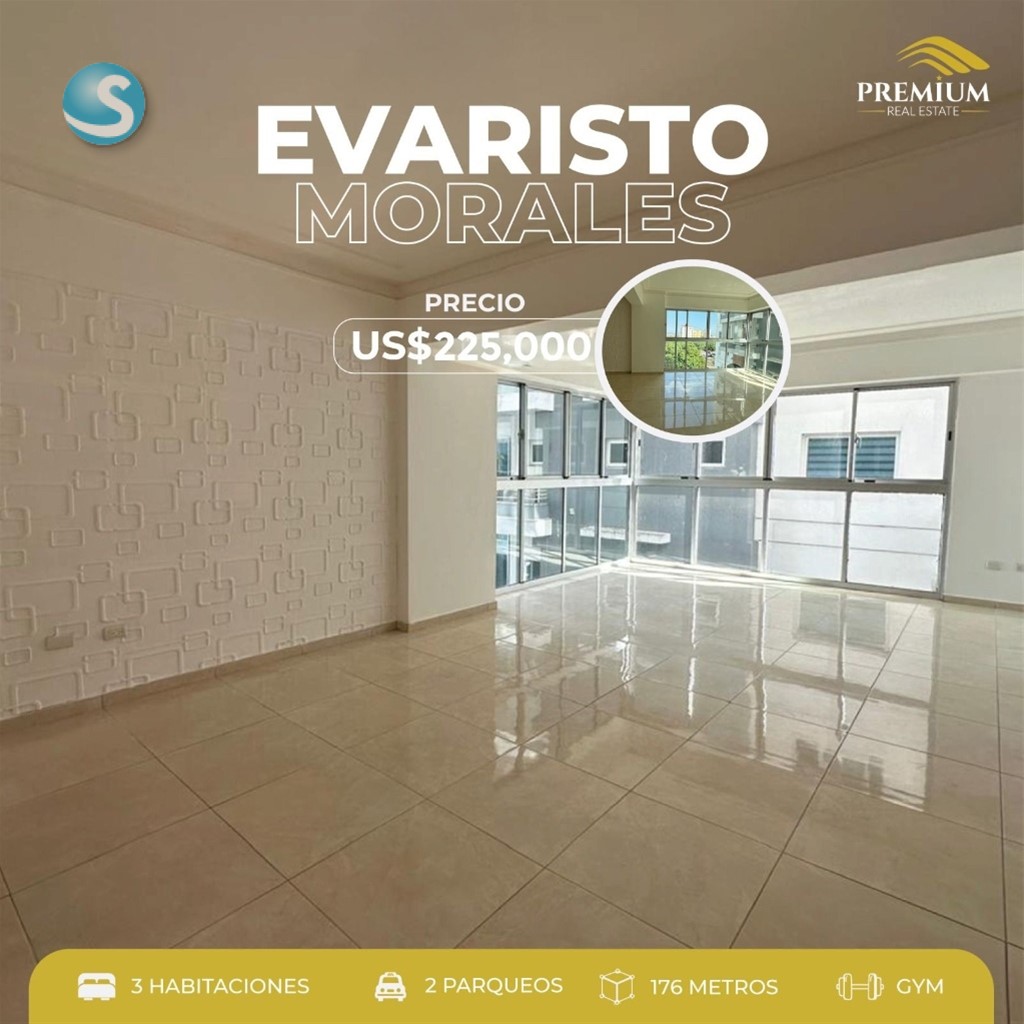 Evaristo Morales 176 mts 6to nivel 3 Habitaciones 3.5 Baños Sala Comedor Estudio Cocina Area de lavado Cuarto de servicio con baño 2 parqueos techados Ascensor privado Gym Terraza Lobby climatizado Precio US$225,000 Mantenimiento RD$9,800
