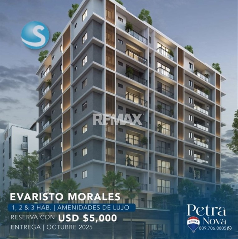 Moderna Torre en construccion: en Evaristo Morales en una de las mejores ubicaciones. Apartamentos de 1 y 3 habitaciones Lobby , dos Ascensores Planta Full , Gimnasio Area de juegos, Terrazas, Piscina Disfruta un estilo de vida moderno en el centro de Santo Domingo en Torre moderna, proxima a la Avenida Winston Churchill. Plan de Pago: Separacion: 5,000 dolares inicial 20% Entrega abril 2026