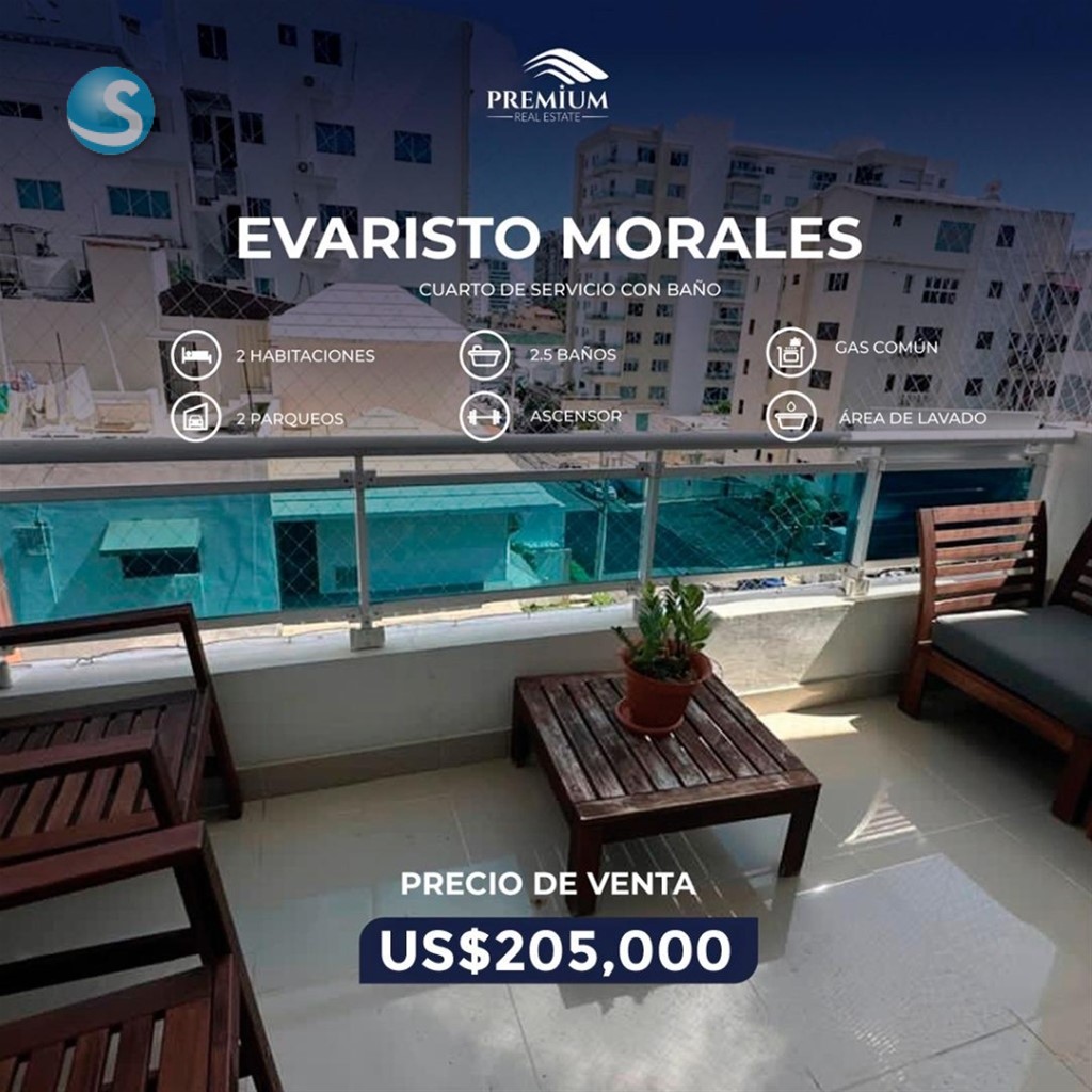 Evaristo Morales Nivel 5 145mts 2 Habitaciones 2.5 Baños Sala Comedor Balcón Cocina Área de lavado Cuarto de servicio con baño 2 Parqueos (1 Techado otro NO) Planta Full Gas Común Ascensor Mantenimiento RD$8,000 Precio US$205,000 Th