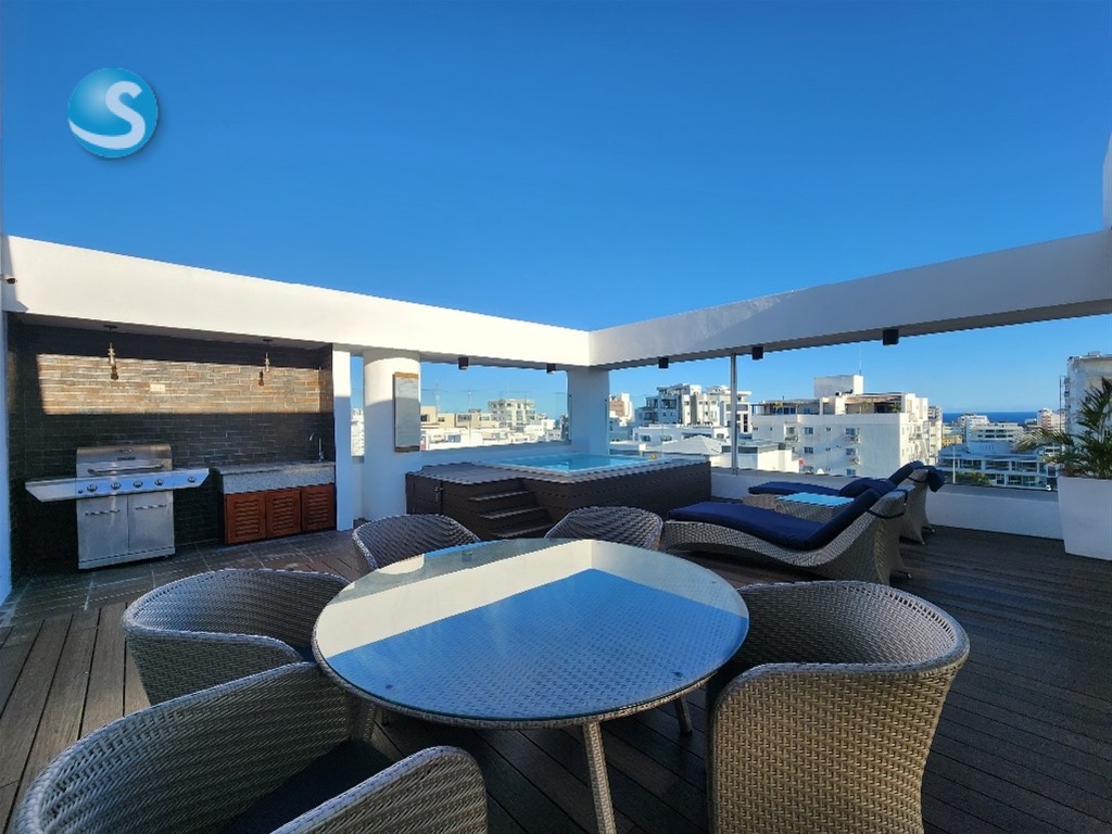 Apartamento en Evaristo Moreales. 149mt2 + 45mt2 de terraza 3 habitaciones + estudio Habitacion principal con 2 walk in closet, ropa blanca 3.5 baños, 2 parqueos Area social con vista al mar 2 jacuzzi. Gimnasio área de niños. Mantenimiento rd$12,000 Precio US$360,000