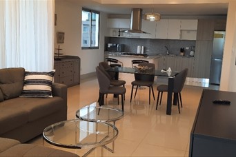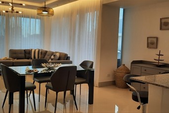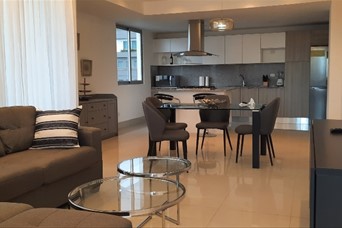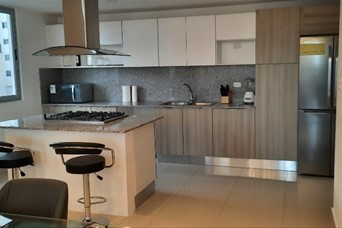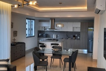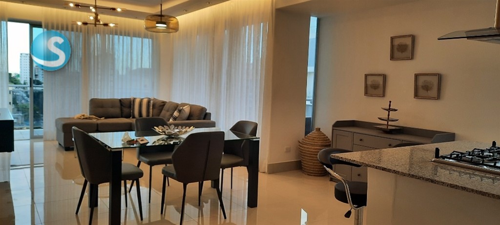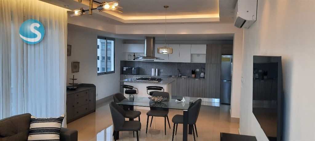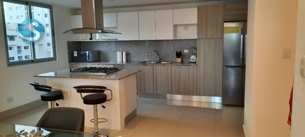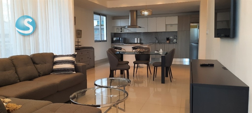 Hermoso y amplio apartamento finamente amueblado, 2 habitaciones, 2.5 baños, habitación de servicio, área de lavado, balcón amplio con vista despejada de la ciudad, 2 parqueos techados e independientes. Lobby, dos ascensores, piscina, terraza destechada, gym, salón de reuniones. US$1,550