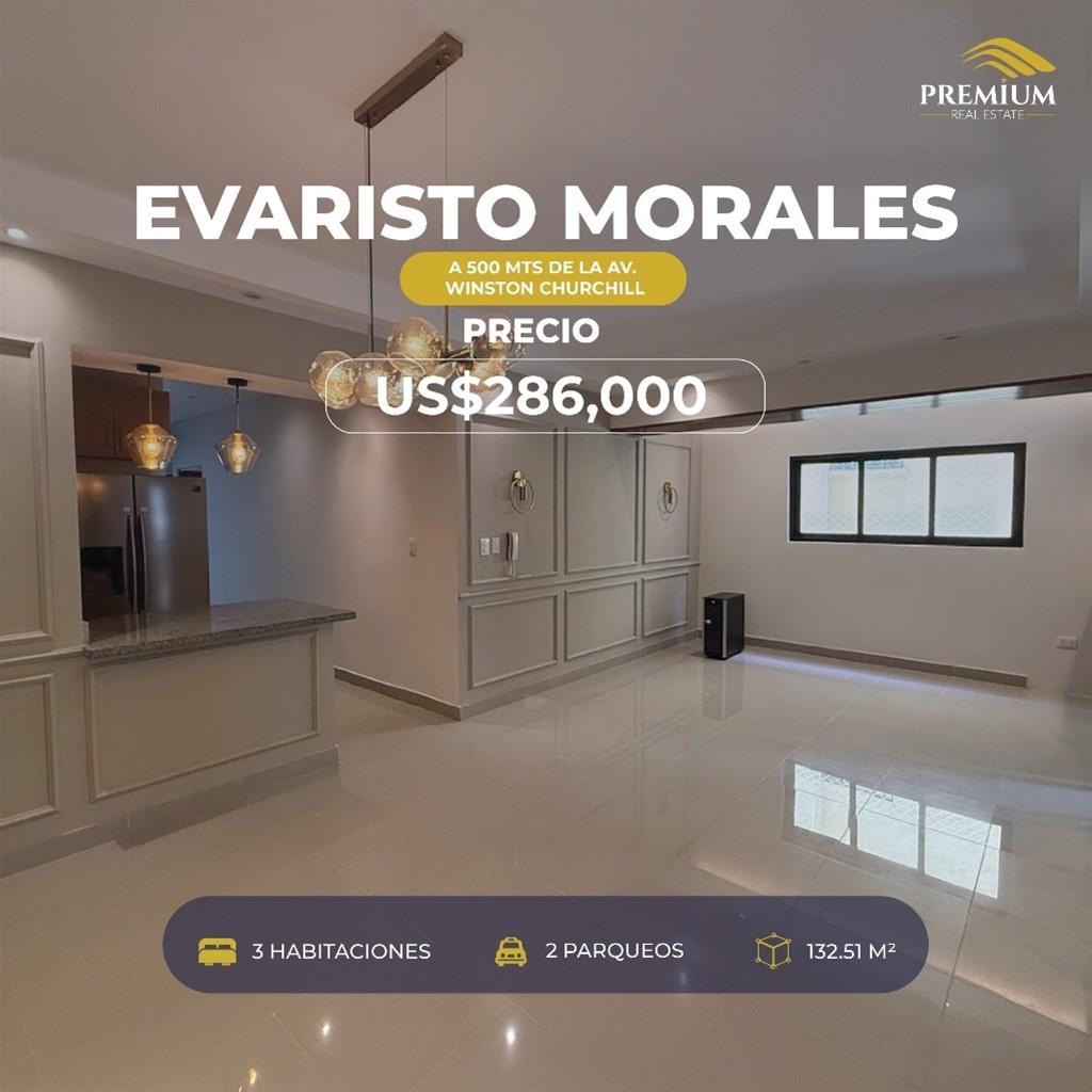 Evaristo Morales Torre familiar 132.51mts netos 5to nivel 3 habitaciones (principal con W/C y baño) 2.5 baños Estudio Cocina Sala Comedor Cuarto de servicio con su baño Area de lavado 2 parqueos paralelos Área Social con: Gimnasio Salón multiuso climatizado Terraza Lobby Dos ascensores Planta full Gas común Control de Acceso Precio de venta: US$286,000 Mantenimiento : RD$11,000