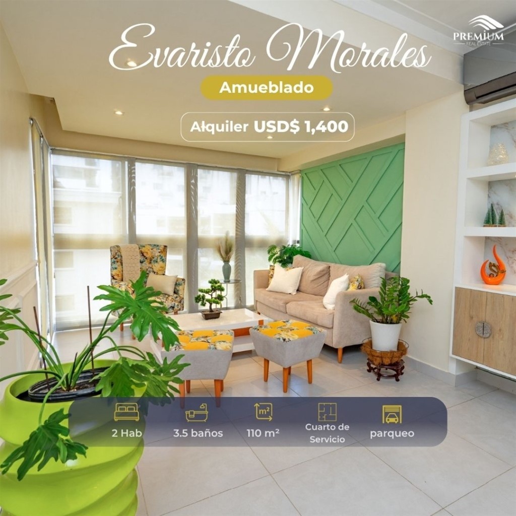 Evaristo Morales | Santo Domingo 110 mts2 2 habitaciones Walking closet 3.5 baños 1 parqueo Vista a la ciudad Sala Comedor Cocina Área de lavado Cuarto de servicio con baño Torre con seguridad Ascensor Alquiler USD$1,400