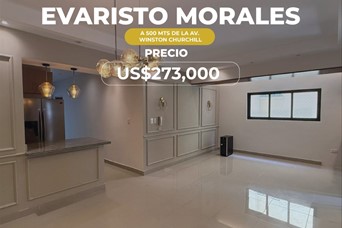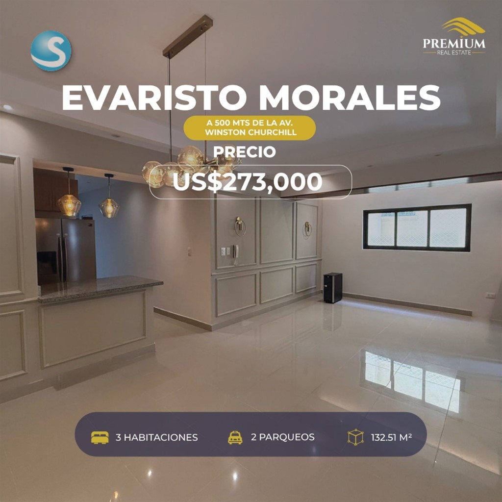 Evaristo Morales, a 500mts de la Av. Winston Churchill Torre familiar 132.51mts netos 5to nivel 3 habitaciones (principal con W/C y baño) 2.5 baños Estudio Cocina Sala Comedor Cuarto de servicio con su baño Área de lavado 2 parqueos paralelos Área Social con: Gimnasio Salón multiuso climatizado Terraza destechada Lobby 2 ascensores Planta full Gas común Control de Acceso Precio de venta: US$273,000 Mantenimiento : RD$11,000