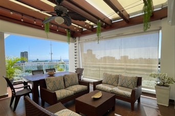 Alquilo Pent-house totalmente amueblado. 274 mts2 de construcción 3 habitaciones 3 baños 2 baños de visitas Elevador Balcón Terraza privada con BBQ Cuarto de servicios Área de lavado Family Sala Comedor Cocina Área común Gimnasio 3 parqueos Incluye: Mantenimiento e Internet. Precio us$1,900