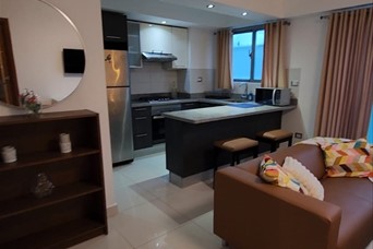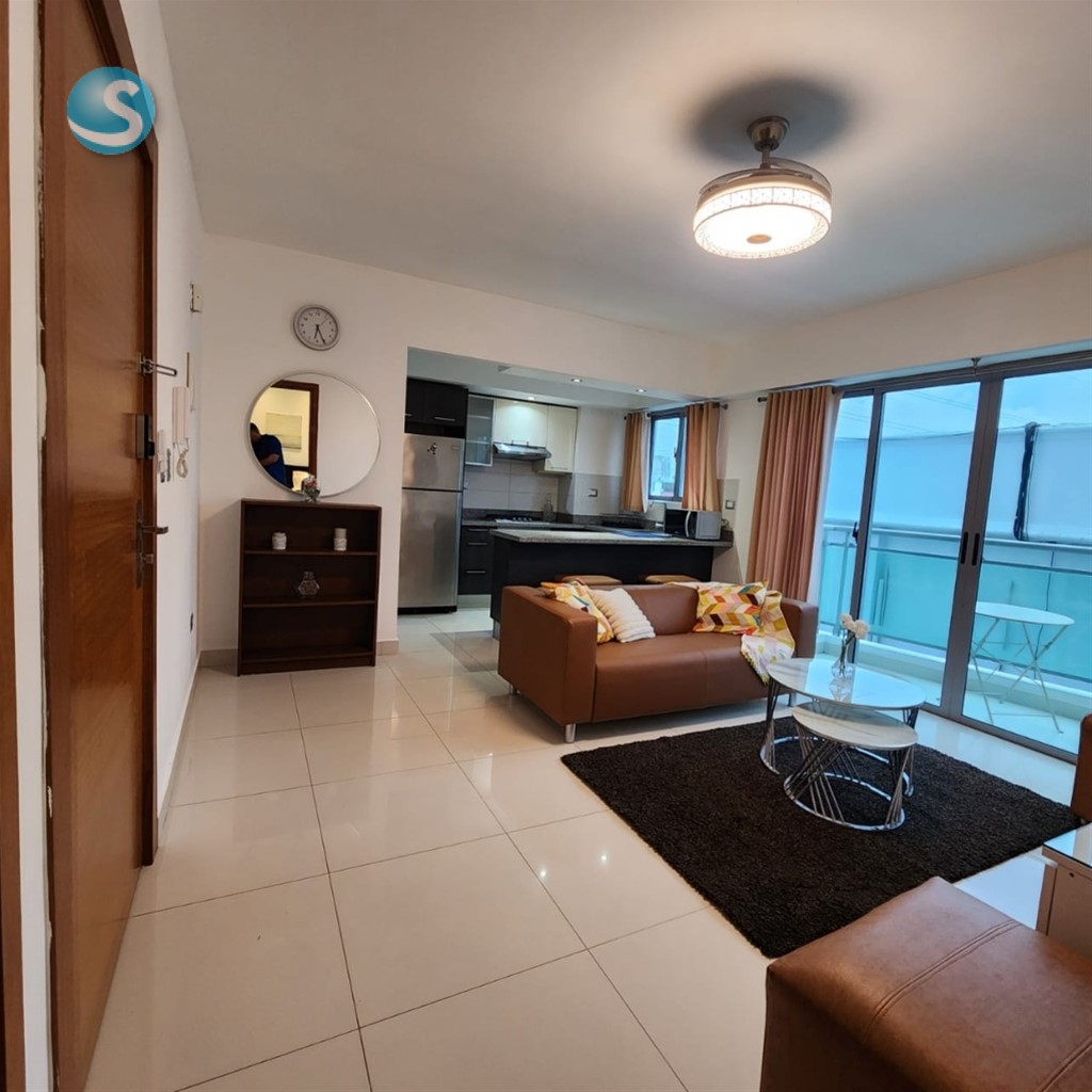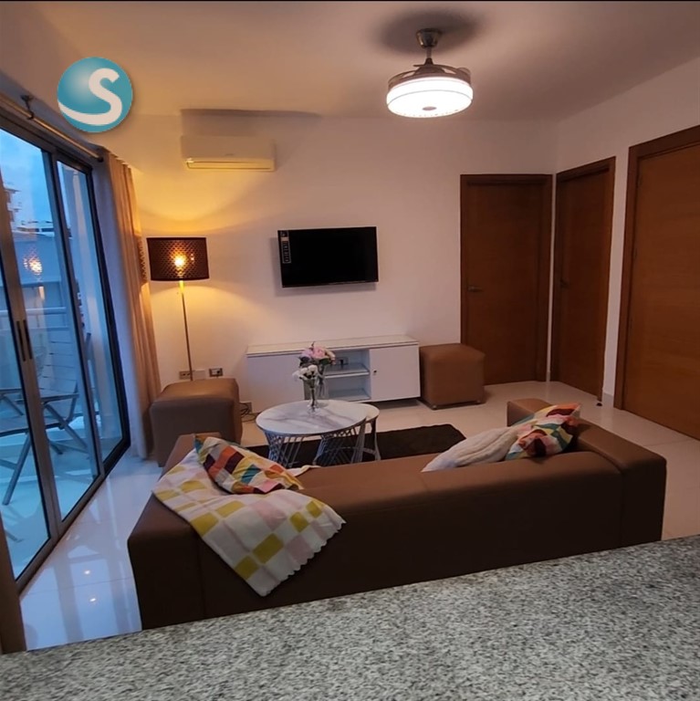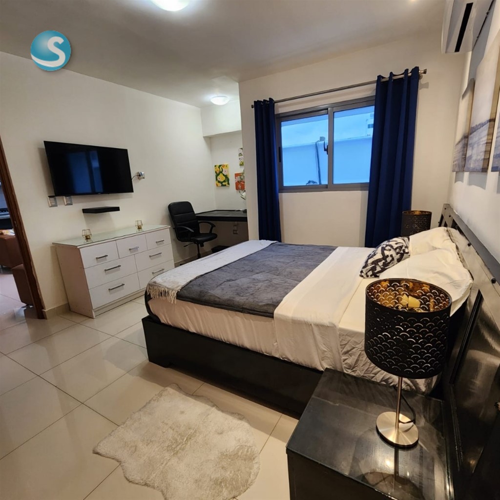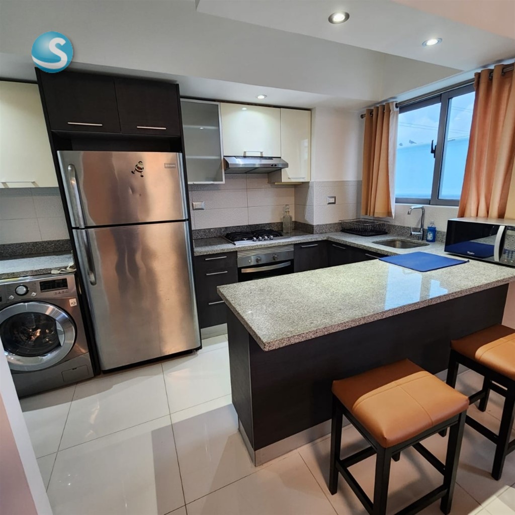 EB-VT0653 Se alquila elegante apartamento totalmente amueblado en la prestigiosa zona de Gazcue, Santo Domingo. Cuenta con: - 1 habitación, 1 parqueo, sala, cocina modular, desayunador, área de lavado, balcón con malla de protección. - 1 baño y ½, terminaciones de primera, ventanas anti-ruido, decoración moderna en tonos europeos. - Full amueblado y climatizado. Facilidades del edificio: gimnasio, lobby, sala de espera, área social, BBQ, dos terrazas con vista panorámica al Malecón, ascensores, vigilancia 24 horas, circuito cerrado, cerca eléctrica y mayordomía.