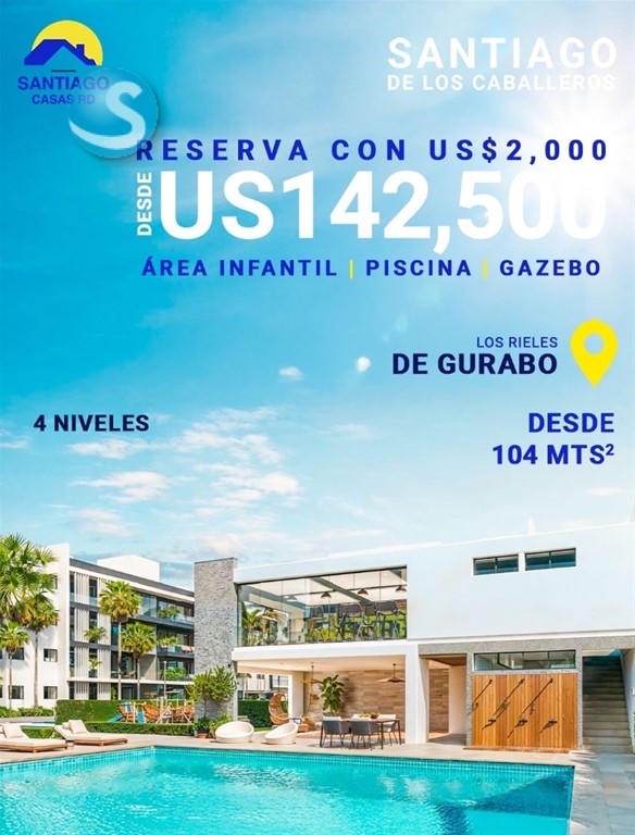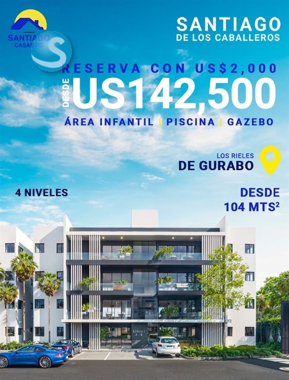Vista de los Rieles 2 es un proyecto residencial ubicado en la carretera Los Rieles, Gurabo, Santiago, diseñado para brindar confort, seguridad y un estilo de vida moderno. Amenidades principales: • Residencia cerrada con seguridad 24/7. • Piscina, gimnasio, área social, planta eléctrica, cisterna, portón eléctrico e intercom. Características de los apartamentos: • 104 m²: sala, balcón, comedor, cocina, tres habitaciones, dos baños y un parqueo. Condiciones de compra: • Separación con $2,000 USD, firma de contrato con $3,000 USD y el resto en construcción. ¡Un lugar ideal para vivir con todo lo que necesitas cerca de ti! Contáctanos para más información o separar el tuyo.
