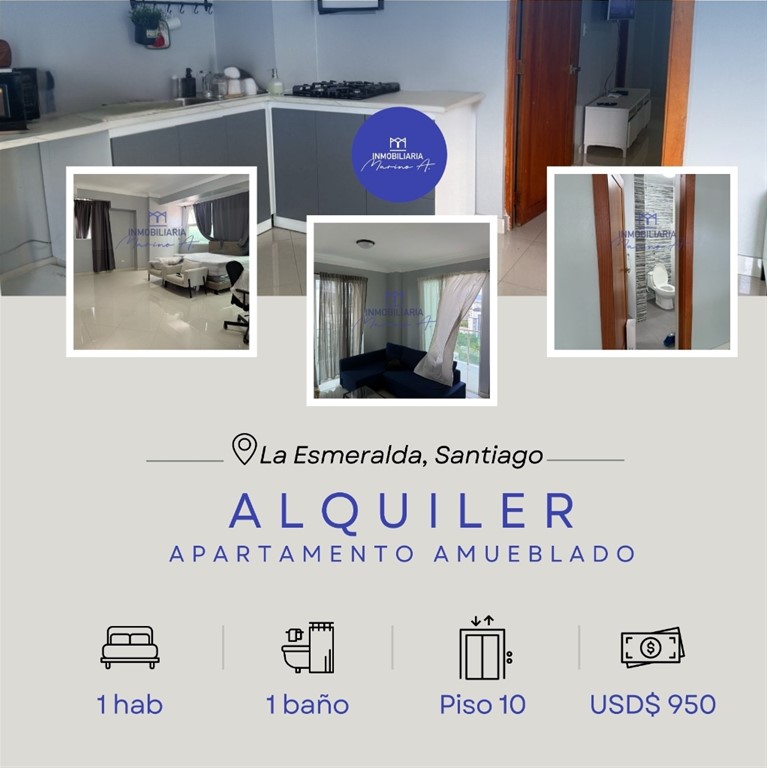 Se alquila Apartamento Amueblado La Esmeralda, Santiago Precio: USD$950 Amenidades: Piso 10 Ascensor con Control de Acceso 1 habitación Grande (Cama King Size) 1 Baño 1 Parqueo Sala Comedor Cocina Balcón Aire Acondicionado TV Smart Para más información 809-903-8000. Inmobiliaria Marino A . Tenemos 13 años en el Mercado Inmobiliario. Con una amplia Cartera de Propiedades en Alquiler y Venta.