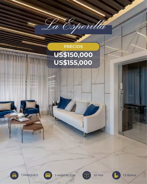 La Esperilla ?????? 53 metros Netos Piso 3 y 4 1 hab 1.5 baños Sala Comedor Cocina Área de lavado 1 parqueo Amenidades : 2 ascensores Lobby Amueblado y climatizado Piscina Terraza techada y destechada Gimnasio Área de niños BBQ Precios: US$150,000 US$155,000 fck