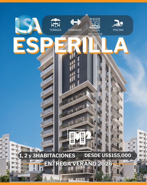 LA ESPERILLA APARTAMENTOS DESDE US$155,000.00 HABITACIONES: 1, 2, 2 más estudio y 3 BAÑOS: 1.5, 2.5 y 3.5 ENTREGA: Verano 2026 AMENIDADES: Lobby amueblado 1 y 2 parqueos Amplia terraza con piscina y BBQ Salón multiusos Gimnasio equipado PLAN DE PAGO: Reserva con US$3,000 10% de inicial 30% durante la construcción 60% contra entrega Vive la elegancia y el confort de La Esperilla, con espacios diseñados para tu estilo de vida. Contáctanos al 849-248-7505 o envíanos un DM para más información.